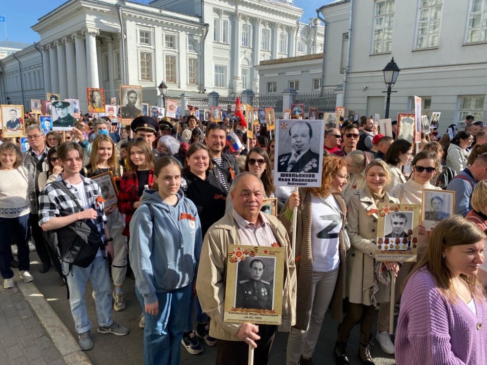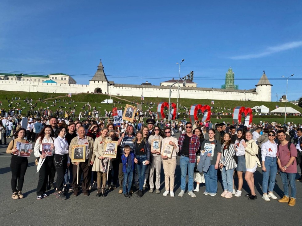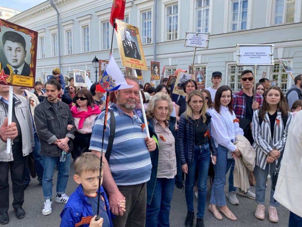 Колонна Университета начала свое движение от главного корпуса, а затем присоединилась к городскому шествию «Бессмертного полка» на пересечении улиц Кремлевская и Лобачевского, прошла по улице Кремлевской до Площади Тысячилетия.
