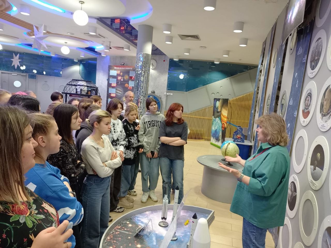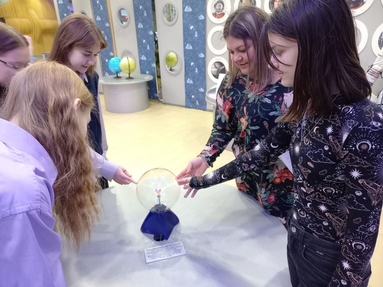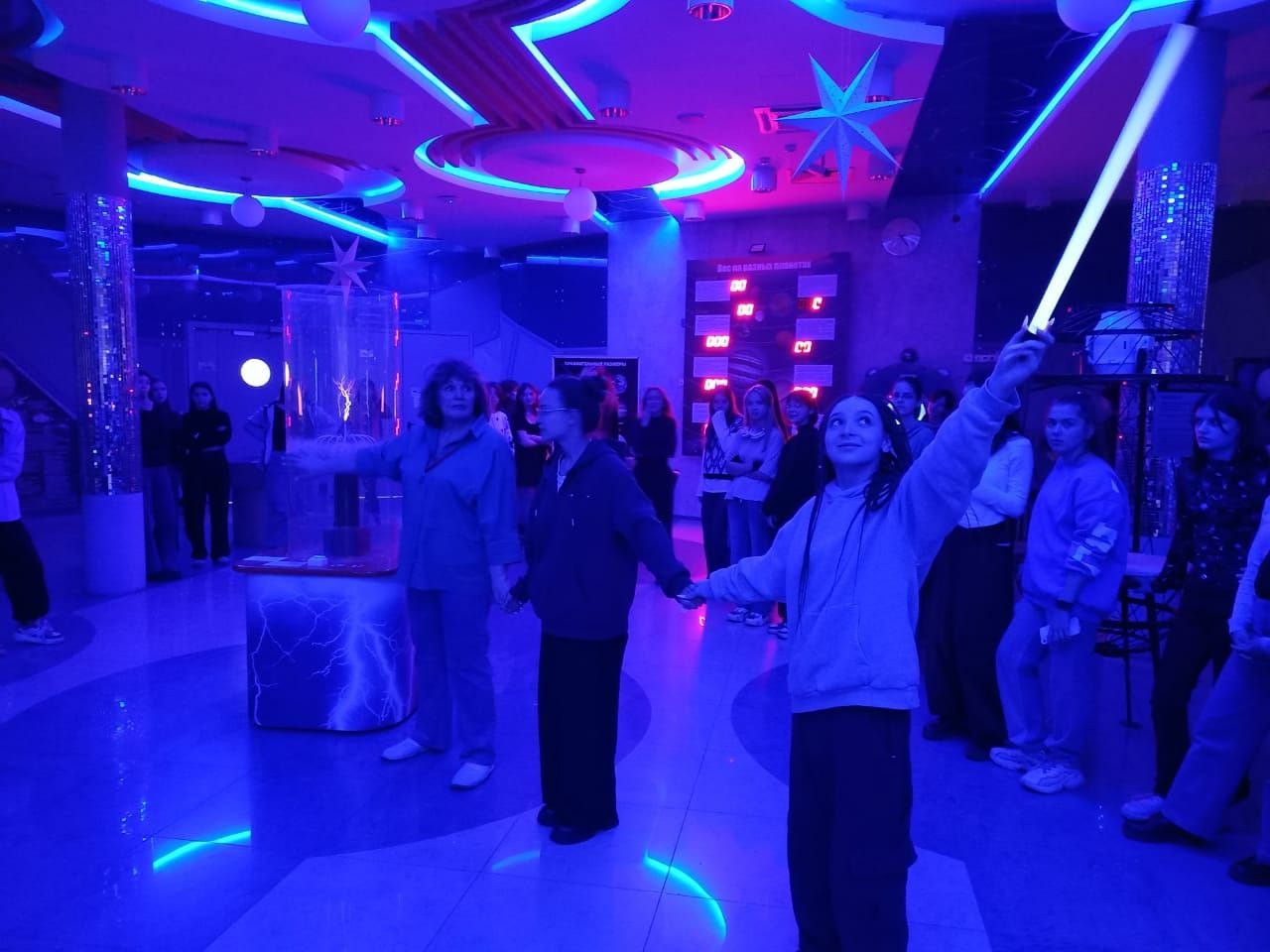 Программа началась с посещения выставочного зала, где были представлены экспонаты, связанные с первыми космическими полетами и достижениями российской космонавтики. Среди них были макеты ракет, скафандр космонавтов и даже макет лунной поверхности. Кроме того, в зале были представлены экспонаты, демонстрирующие различные физические явления, связанные с астрономией и космосом. Особый интерес вызвала катушка Тесла - устройство, создающее высокое напряжение, которое используется для изучения электромагнитных явлений. Экскурсовод рассказала о принципе работы катушки и продемонстрировала ее возможности, создав впечатляющие молнии и искры.