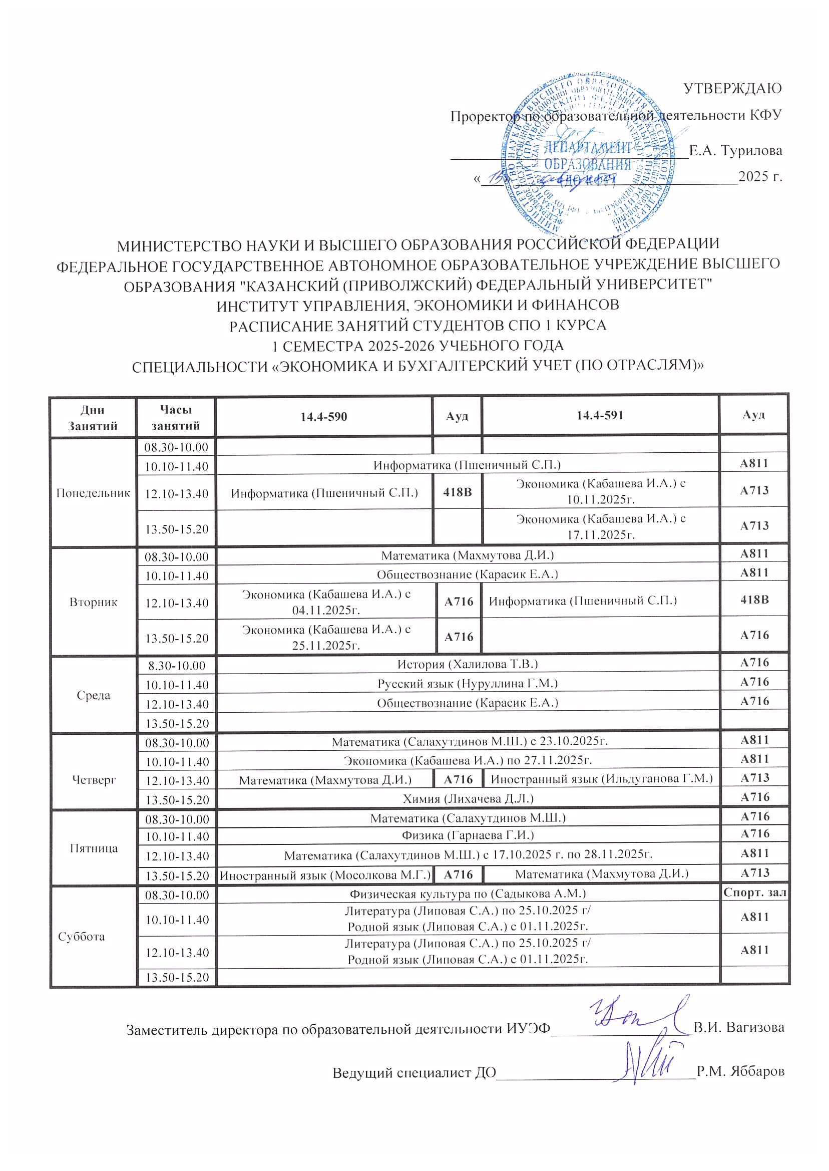 Расписание занятий 1-го курса очной формы обучения специальности "Экономика и Бухгалтерский учет(по отраслям)" групп 14.4-590, 14.4-591