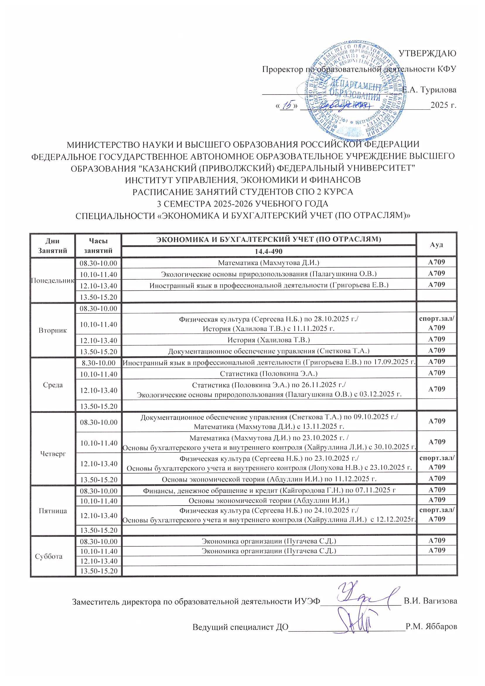 Расписание занятий 2-го курса очной формы обучения специальности "Экономика и Бухгалтерский учет (по отраслям)" группы 14.4-490