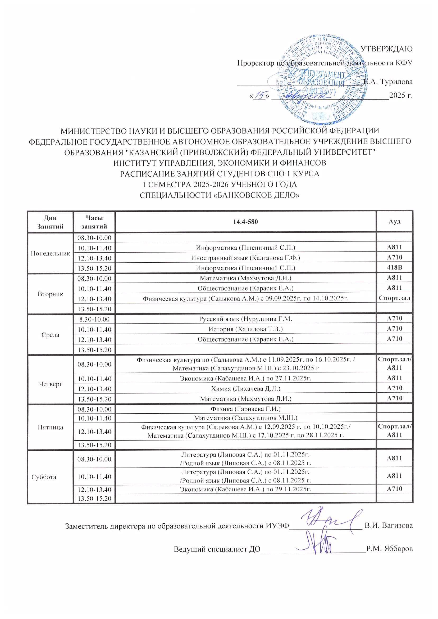 Расписание занятий 1-го курса очной формы обучения специальности "Банковское дело" группы 14.4-580