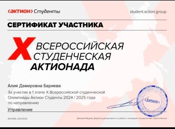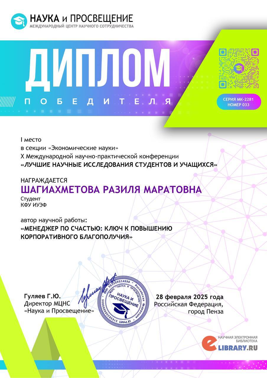 Шагиахметова Р.Р. Менеджер по счастью: ключ к повышению корпоративного благополучия/ ЛУЧШИЕ НАУЧНЫЕ ИССЛЕДОВАНИЯ СТУДЕНТОВ И УЧАЩИХСЯ: сборник статей X Международной научно практической конференции. Пенза: МЦНС «Наука и Просвещение». 28 февраля 2025, с.90 -93 (Диплом победителя 2 места)