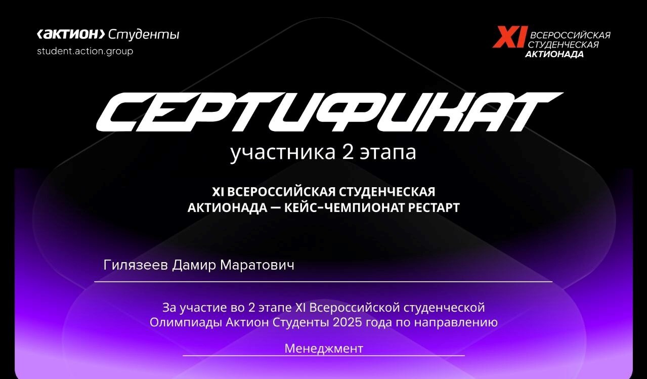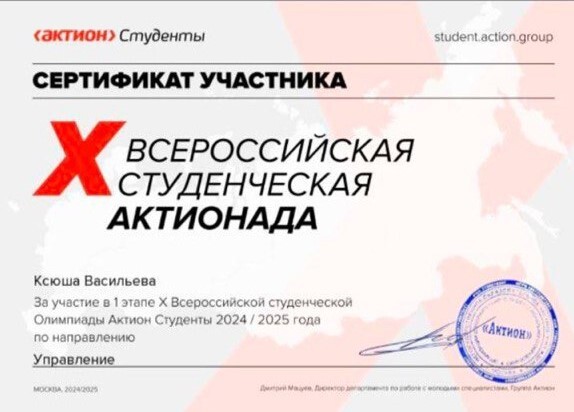 Садаков В.В. (1 курс) Экономика впечатлений// СТУДЕНЧЕСКИЙ НАУЧНЫЙ ФОРУМ 2025: сборник статей XVI Международной научно практической конференции. Пенза: МЦНС «Наука и Просвещение», 12 марта 2025 г., с.63-65 (Диплом победителя 1 места)