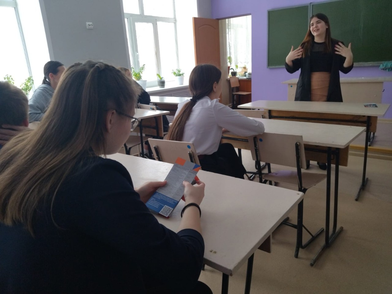Были приглашены школьники 9-11 классов. показала презентацию, рассказала о направлениях и предоставила ребятам буклеты.