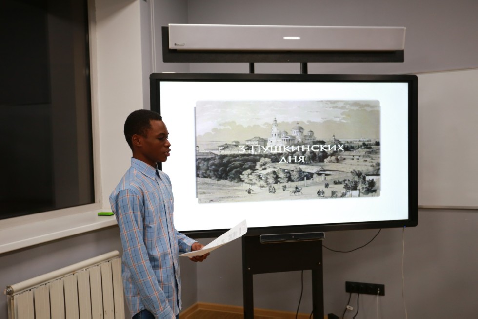 Студент Института физики Мампуя Рельпи Продиж из Республики Конго выступил с докладом: «Три Пушкинских дня», в котором познавательно рассказал о пребывании поэта в Казани в сентябре 1833 года, который он посетил в рамках своей работы над историческим романом о событиях крестьянской войны 1773–1774 гг. под руководством Е. Пугачева.