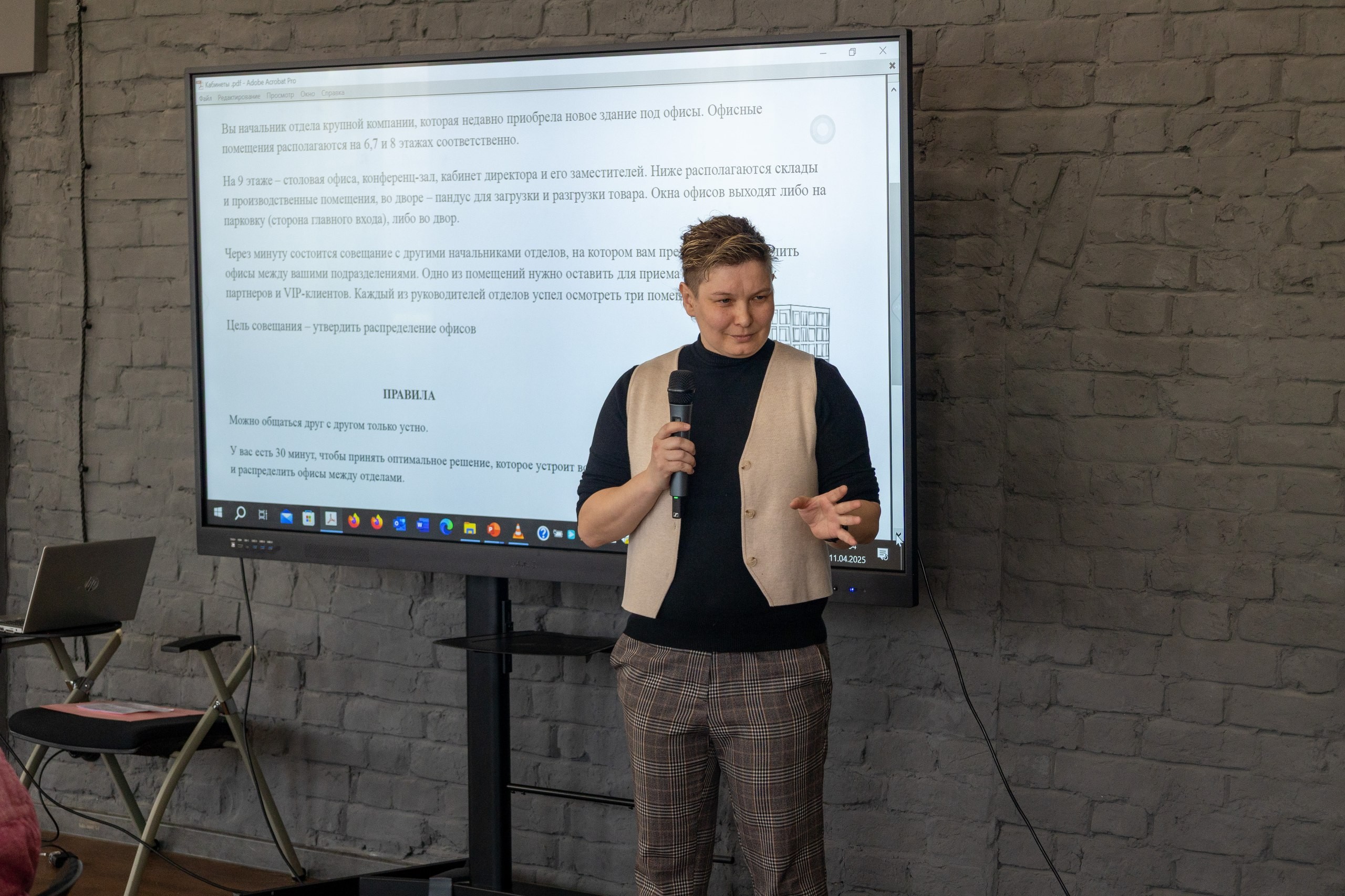 Заведующая кафедры регионоведения и цифровой гуманитаристики Института международных отношений, истории и востоковедения Луиза Каримова провела интерактивную командную игру, моделирующую реальную рабочую ситуацию. Участники берут на себя роли руководителей отделов крупной компании, столкнувшейся с необходимостью распределения офисных помещений в новом здании. В условиях ограниченного времени команда должна принять решение о том, каким образом будут распределены офисы между подразделениями, а также определить одно из помещений для приема VIP-клиентов и партнеров.