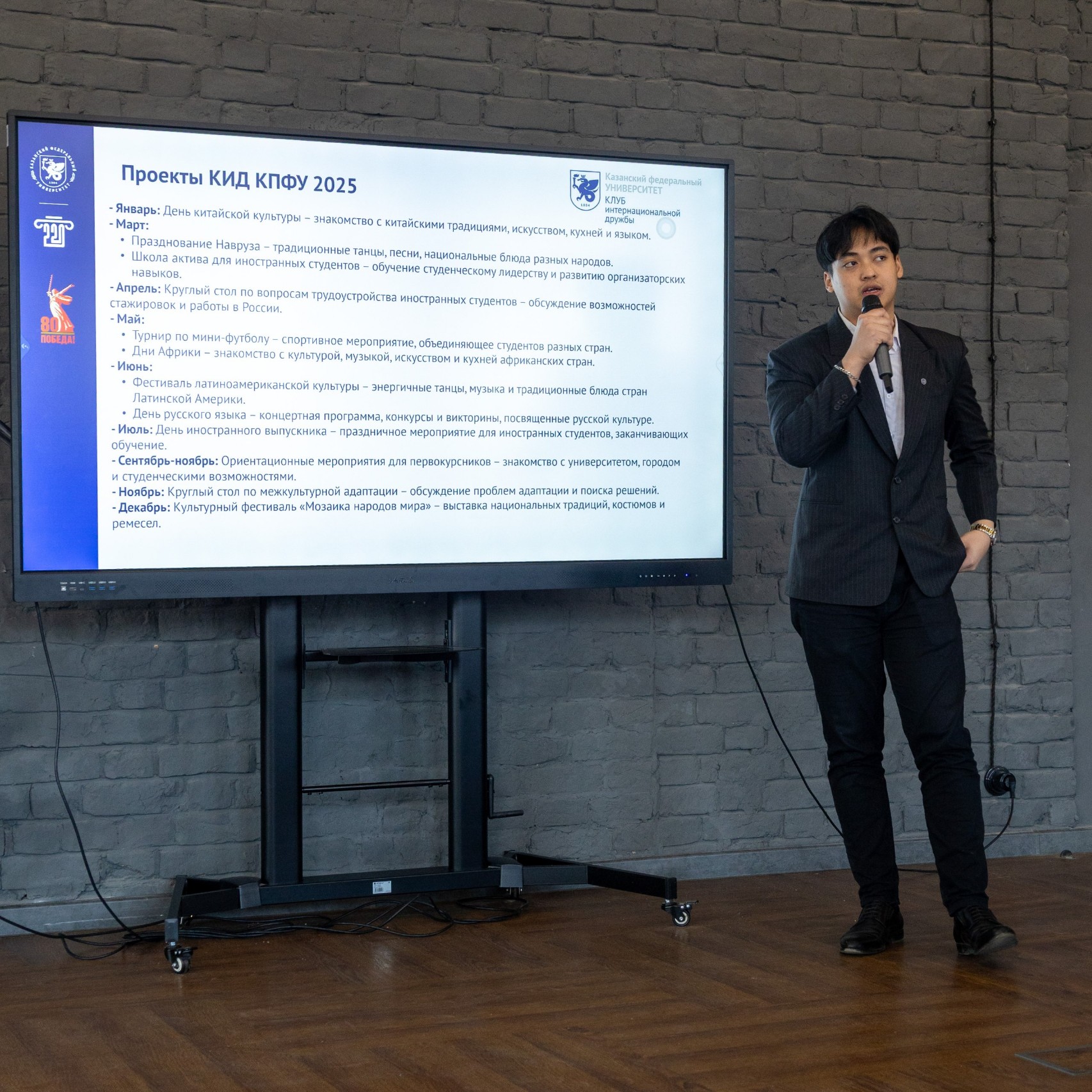 Руководитель Клуба интернациональной дружбы (КИД) КФУ Вардана Рифки Кусума представил деятельность клуба и рассказал о реализуемых проектах. В ближайшее время клуб готовится провести ряд мероприятий, способствующих поддержке межкультурного диалога и многообразия культур в университете: Фестиваль латиноамериканской и карибской культуры, Дни Африки и День иностранного выпускника КФУ – 2025.