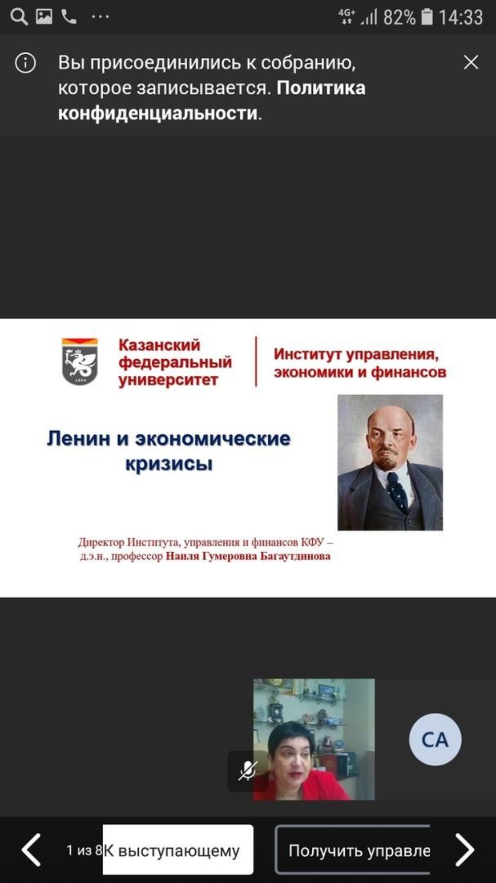 В разрезе актуального обсуждения был посвящен доклад директора Института экономики, управления и финансов Наили Гумеровны Багаутдиновой. Яркое выступление было наглядно подкреплено презентацией с отсылкой на монографию Ленина, посвящённой анализу экономического развития России «Развитие капитализма в России. Процесс образования внутреннего рынка для крупной промышленности». Участники заслушали также Евгения Батыровича Султанова, заведующего кафедрой и доцента Юридического факультета. В его выступлении освещались Ленинские идеи организации государственного строительства и практика их реализации». Историко-правовой анализ Конституции РСФСР 1918 года дала в своем послании к участникам онлайн-собрания Чулпан Хамитовна Саматова, доцент ИМО.