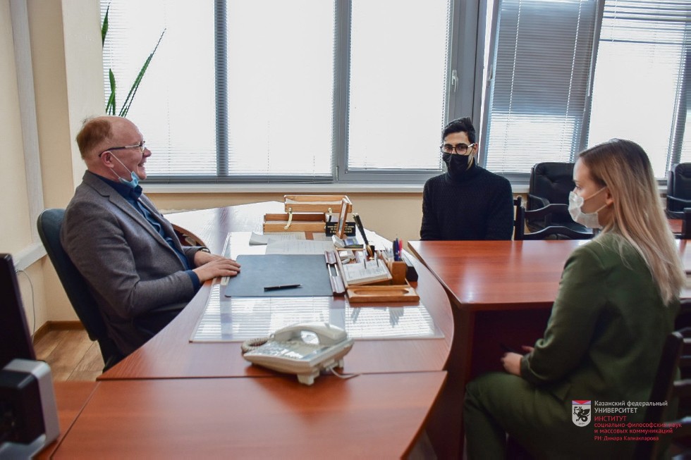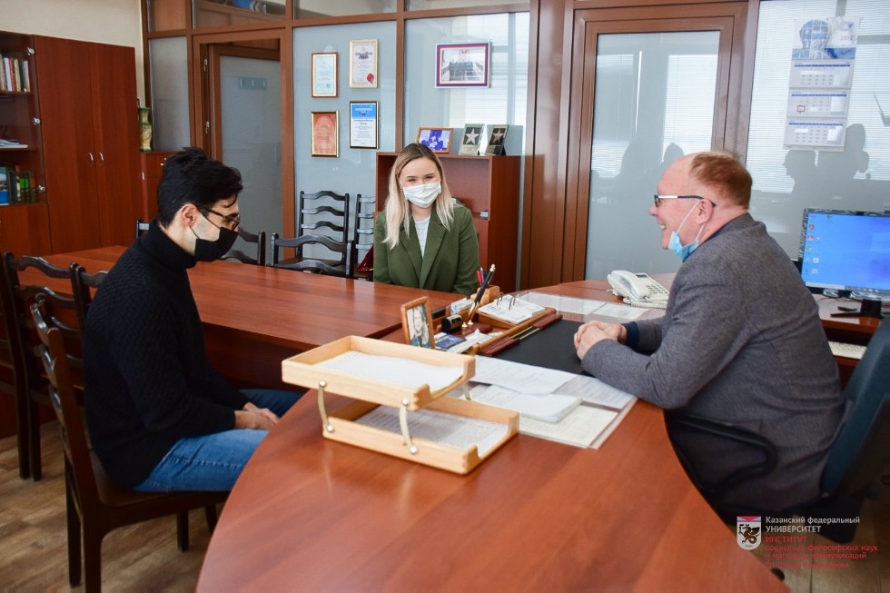 Антонис Каравалис, прибывший к нам из Сорбонны, пройдет обучение на направлении "Философия". Антонис в разговоре с Михаилом Дмитриевичем признался, что при выборе места своего обучения и направления подготовки ему было важно определиться с тем, что ему предстоит изучать и в каком окружении он будет жить на протяжении нескольких месяцев. Поэтому им был выбран Казанский университет: во-первых, из-за наличия в учебном плане направления "философия" интересных дисциплин и авторских курсов, во-вторых, из-за богатой истории города Казани и его культурного разнообразия.