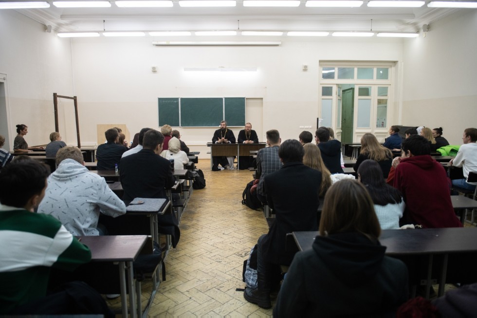 Руководитель миссионерского отдела Казанской Епархии священник Александр Ермолин и заместитель руководителя миссионерского отдела Казанской Епархии священник Александр Данилов рассказали студентам о своем личном пути к принятию сана и об особенностях повседневной жизни современного священника, развеяли некоторые предубеждения и предрассудки о представителях духовенства, ответили на вопросы студентов. Встреча прошла в очень теплой, искренней и дружеской атмосфере.