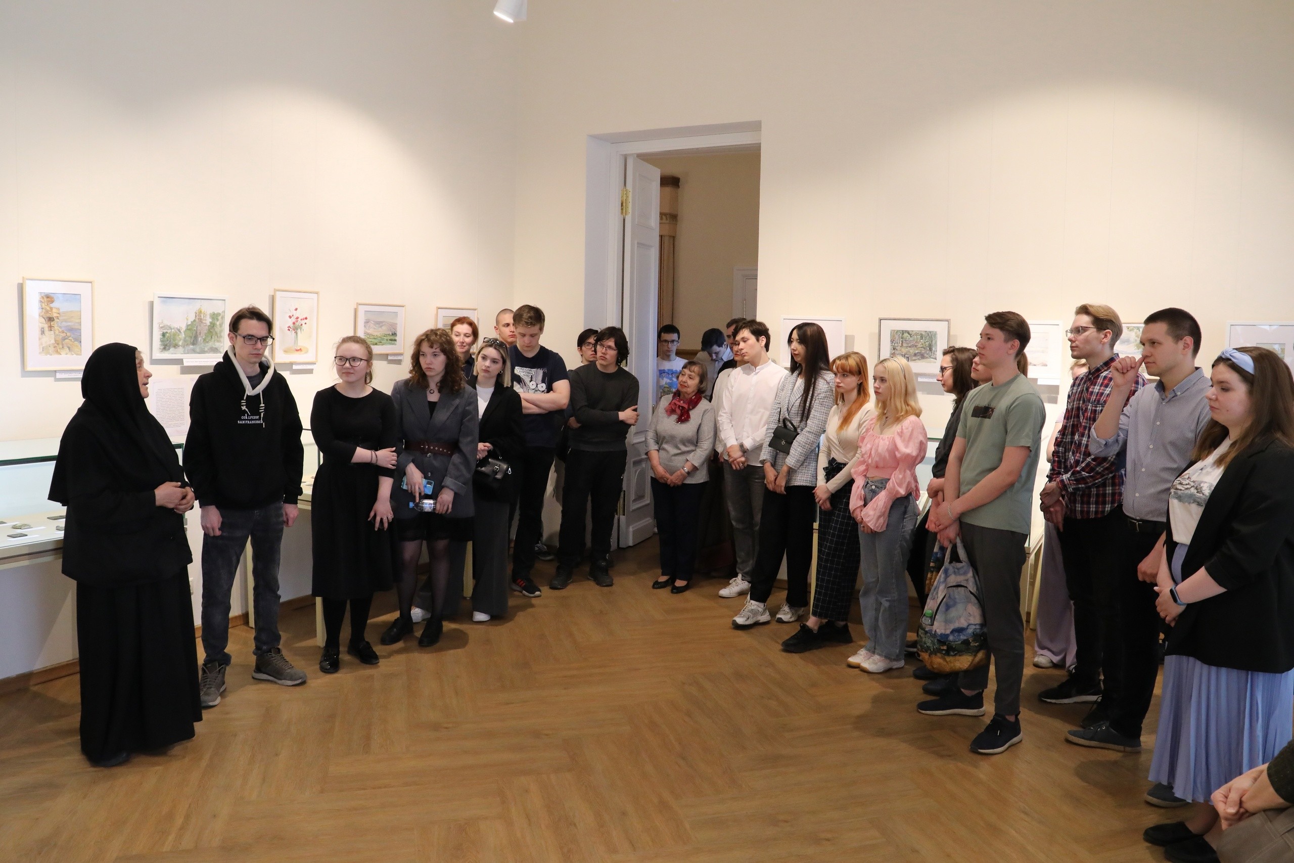 Козаева Мария (1 курс, теология): "Матушка Варвава очень располагающая, экскурсия пролетела для меня в один миг, так увлечённо я давно не слушала, хотелось ещё) Замечательные акварельные картины, очень атмосферные. На книги и иконы тоже очень интересно было посмотреть. Появилось сильное желание побывать на Святой Земле. Осталась под впечатлением, побольше бы таких выставок!".
