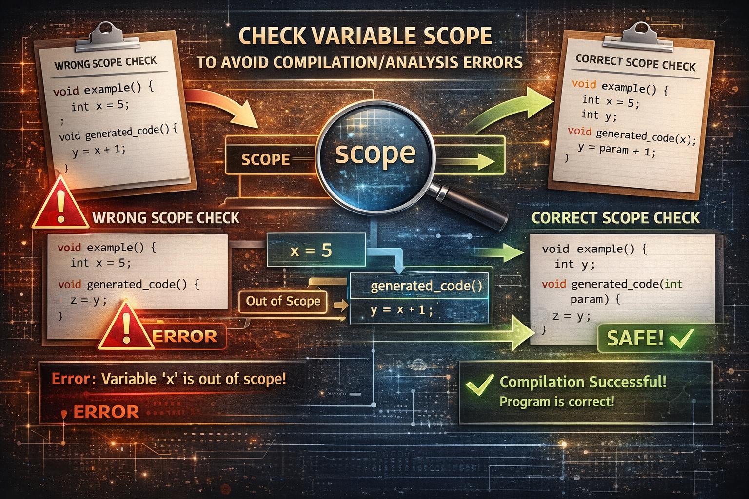 Иногда программы умеют создавать другой код автоматически, как конструктор. Но тут легко получить ошибку: фрагмент сгенерированного кода может пытаться использовать переменную, которая для него «не существует», потому что она была объявлена в другом месте и находится уже вне доступа. Это сравнимо с тем, что мы написали слово в черновике, а потом вырвали страницу и пытаемся читать это слово в тетради. Обычно компилятор обнаруживает такие ошибки заранее, но с генерацией кода все сложнее и некоторые языки делают проверки прямо во время выполнения. Авторы аккуратно описывают такие проверки математически и предлагают более надежный вариант, который лучше отсекает ситуации, когда сгенерированный код случайно использовал «чужую» переменную.