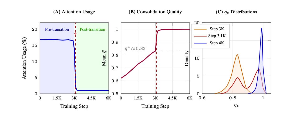 Авторы статьи предлагают способ снизить вычислительную нагрузку моделей с механизмом внимания. Было замечено, что в большинстве случаев модель запрашивает информацию, которую уже можно предсказать по внутреннему состоянию. Они вводят механизм консолидации памяти. Редкие и необычные случаи сохраняются отдельно, а типичные ответы постепенно усваиваются внутренней моделью. Когда система уверена в прогнозе, она не обращается к блоку внимания и использует сохранённые знания. По мере обучения таких обращений становится значительно меньше, что резко сокращает объём вычислений без потери качества. Метод также позволяет переносить выученные закономерности на новые задачи и делает работу модели более эффективной.