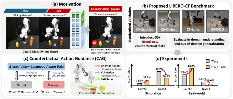 Когда роботу дают словесную команду и показывают сцену, он должен выполнить то, что просят. Но модели, которые смотрят и слушают одновременно, иногда действуют по привычке и выбирают объекты, которые чаще видели в обучении, а не те, о которых говорит команда. Это явление назвали контрфактуальными сбоями. Чтобы изучить его, авторы сделали тест, где одна и та же сцена идёт с разными командами и проверили, насколько модель следует языку. Они предложили контрфактуальное руководство действием. Во время выбора действия модель сравнивает политику с учётом команды и политику, которая смотрит только на картинку. Если видно, что визуальная привычка сильнее, алгоритм усиливает роль слов и меняет выбор. Метод не требует дополнительного обучения и легко добавляется в существующие системы. Также авторы представили набор LIBERO CF для проверки и показали существенное улучшение точности и успеха в задачах.