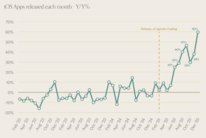 Данные Sensor Tower и отчёт Wells Fargo Securities показали резкий рост новых приложений в App Store. В декабре 2025 года, число релизов iOS приложений выросло примерно на 60 процентов по сравнению с тем же месяцем прошлого года, за годовой период рост составил около 24 процентов. Аналитики связывают это с появлением инструментов, которые позволяют собирать приложения с минимальным кодированием. Такие инструменты автоматизируют рутинные шаги и помогают превращать идею в рабочую программу быстрее. Это снижает порог входа и даёт возможность многим незнакомым с программированием людям выпускать свои продукты. Авторы отмечают, что это наблюдение пока корреляция, а не доказанная причина, и проводят параллель с запуском iPhone SDK в 2008 году, когда рынок приложений также резко вырос. Это даёт больше выбора, но может снизить среднее качество и усложнить поиск хороших приложений.