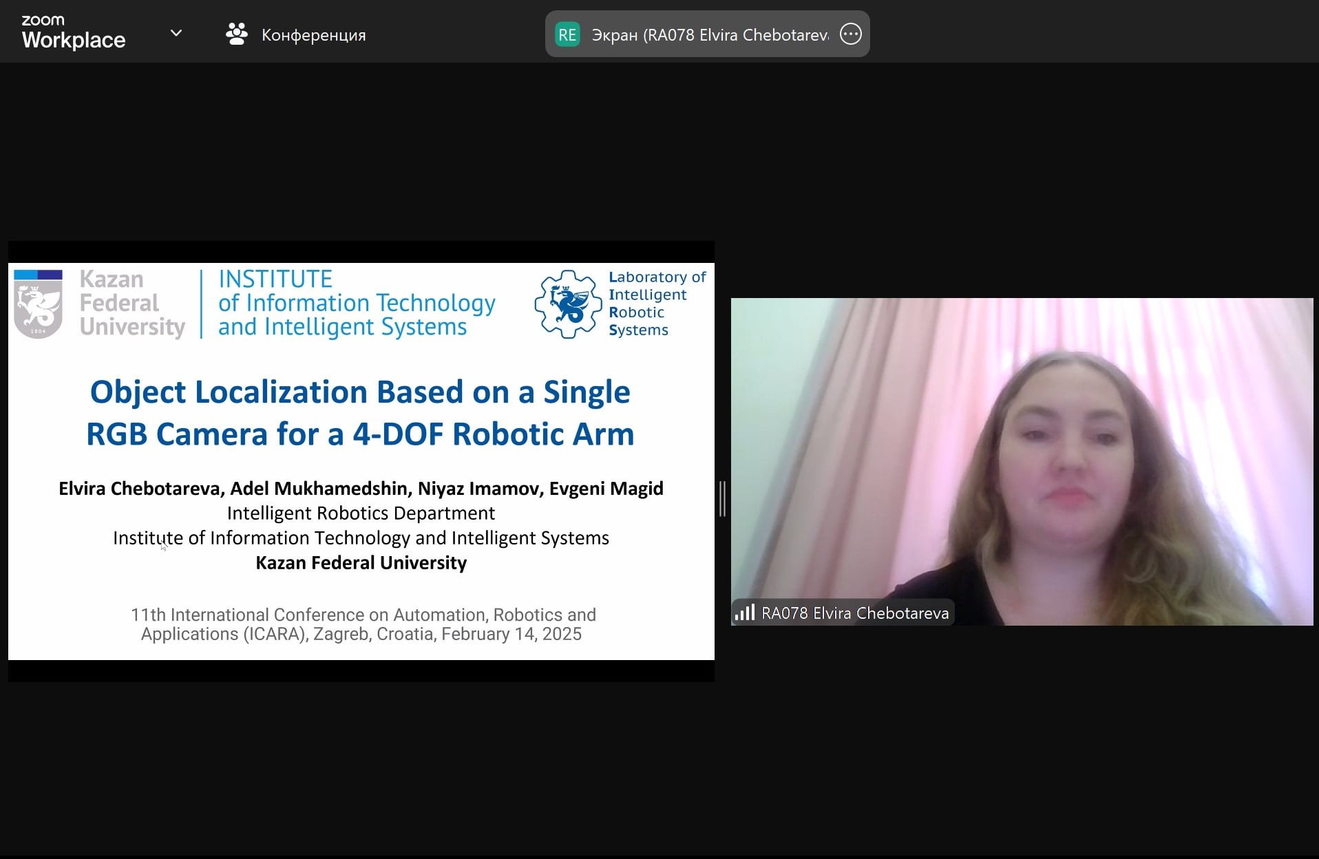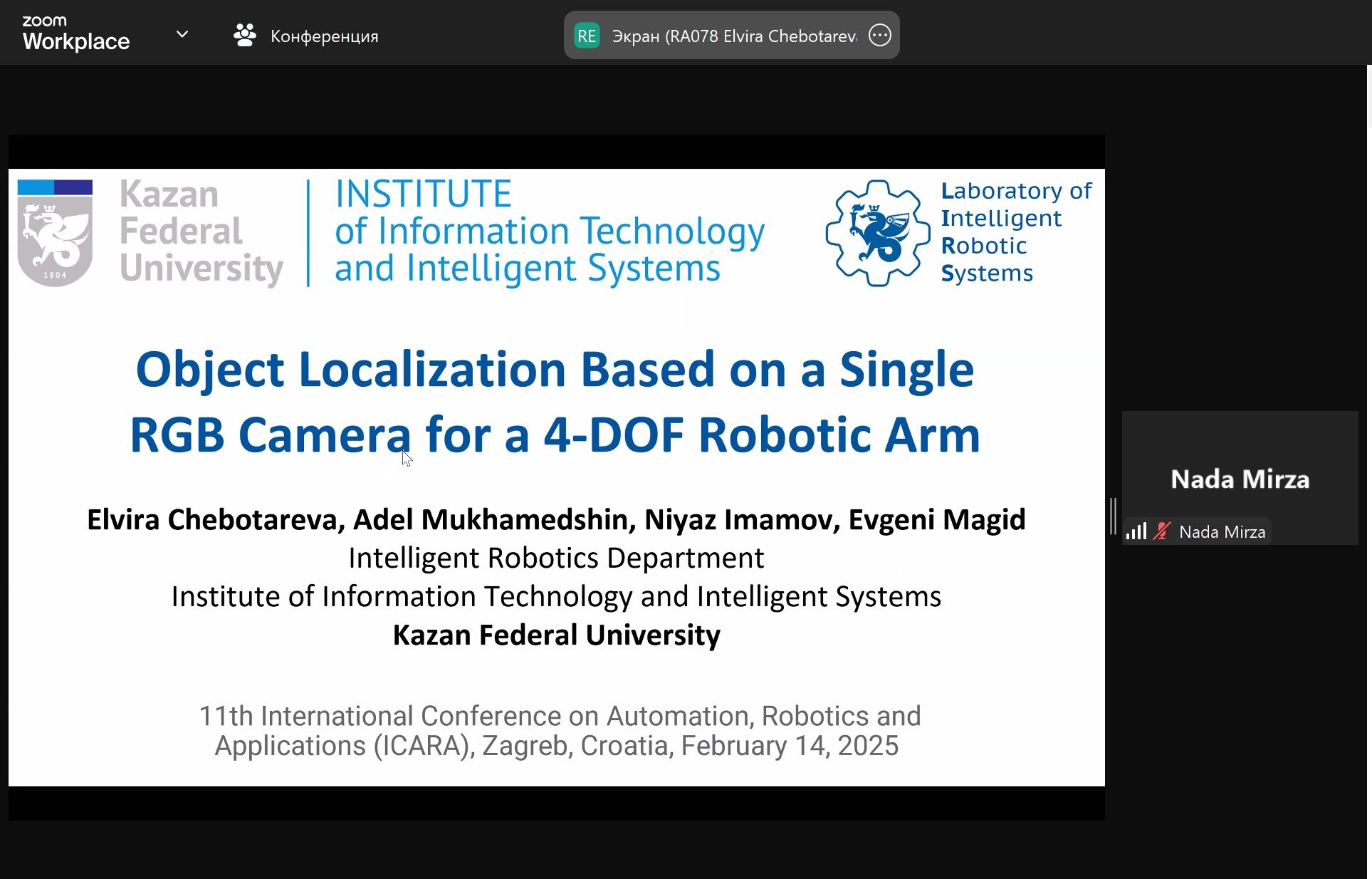 12–14 февраля 2025 года в Загребе, Хорватия прошла 11-я Международная конференция по автоматизации, робототехнике и приложениям (International Conference on Automation, Robotics, and Applications – ICARA 2025). Сотрудники Лаборатории интеллектуальных робототехнических систем (ЛИРС) Эльвира Чеботарева, Нияз Имамов, студент бакалавриата Адель Мухаметшин и руководитель лаборатории Евгений Магид подготовили и представили доклад на конференции. Тема доклада: “Object Localization Based on a Single RGB Camera for a 4-DOF Robotic Arm”.