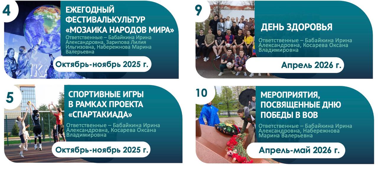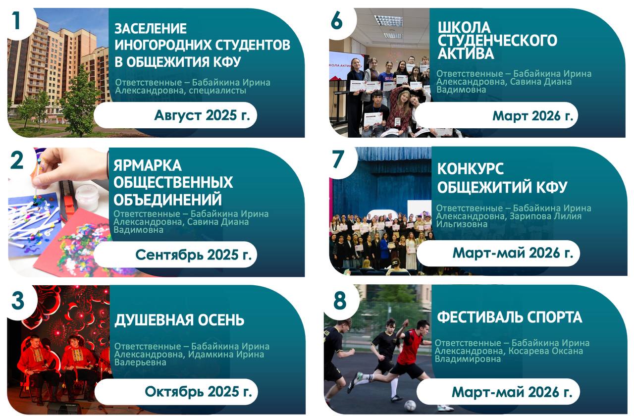 - Организация и проведение интеллектуально-познавательных, культурно-массовых мероприятий с обучающимися в общежитиях КФУ.