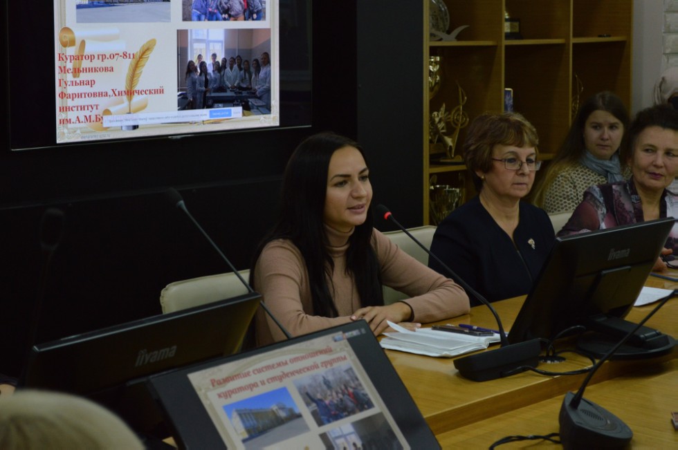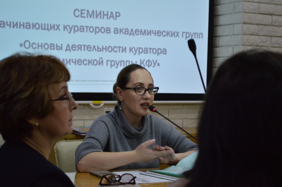 Приглашенные на семинар кураторы поделились своим опытом работы со студентами. Ассистент кафедры химического образования, куратор группы 07-811 Гульнар Фаритовна Мельникова остановилась на вопросах установления и налаживания отношений куратора со студентами группы. Ассистент кафедры германской филологии, куратор группы 10.1-708 Альбина Фанилевна Мухамадьярова раскрыла начинающим кураторам особенности создания и обеспечения эффективной работы органов студенческого самоуправления в группе. Доцент кафедры дошкольного и начального образования, куратор группы 17.1-509 Лера Ахтямовна Камалова поделилась опытом проведения кураторских часов, подробно остановилась на активных формах и технологиях проведения воспитательных мероприятий. Доцент кафедры связей с общественностью и прикладной политологии, куратор группы 13.3-605 Шамиль Ринатович Юсупов рассказал о документах, которых куратор обязан вести, предложил всем кураторам завести папку, с самого начала оформлять портфолио.