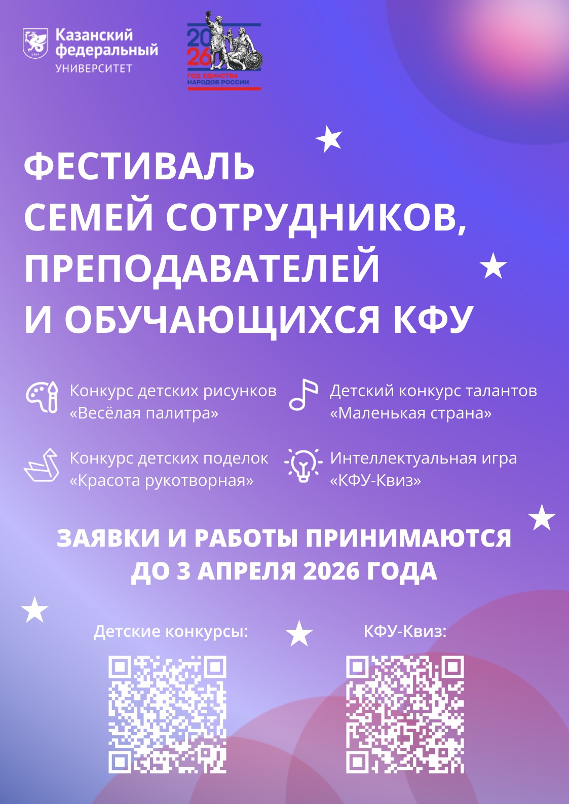 Департамент по молодежной политике совместно с первичной профсоюзной организацией работников и первичной профсоюзной организацией студентов организуют и проводят Фестиваль семей сотрудников, преподавателей и обучающихся КФУ.
