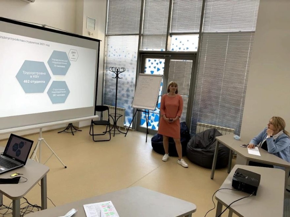 Встреча прошла на площадке координации развития студенческих научных объединений и реализации творческих инициатив КСК КФУ «УНИКС». Модератором встречи выступила Закирова Эльвира — руководитель Центра по организации временной занятости обучающихся. Она рассказала о самом молодом подразделении Департамента по молодежной политике КФУ, функциях и задачах, стоящих перед центром, а также о реализованных проектах, достижениях и результатах работы за 2020 год. Особое внимание было уделено предстоящей Ярмарке вакансий, которая состоится 23 апреля в КСК КФУ «УНИКС» и объединит вокруг себя более 100 работодателей, а также большое количество заинтересованных студентов.