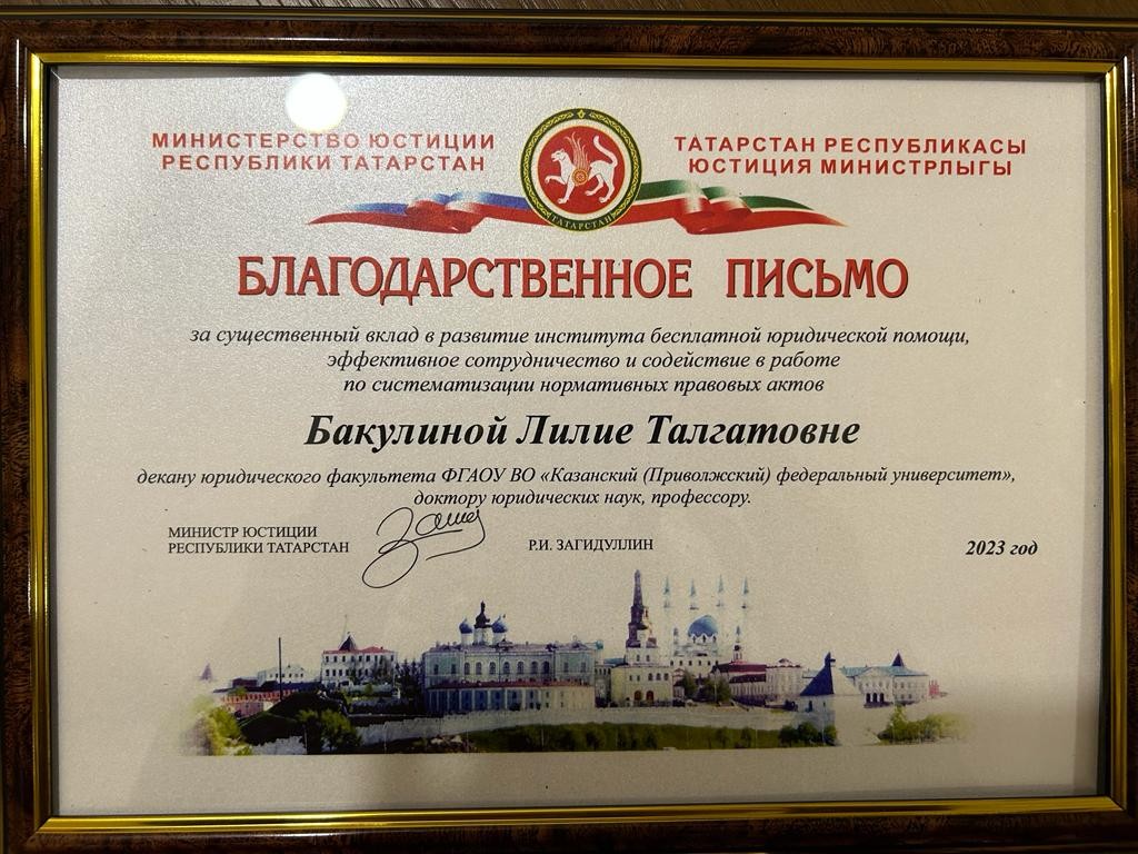 Декан Юридического факультета Бакулина Лилия Талгатовна Адрес: 420008, г. Казань, ул. Кремлевская, д. 18, каб. 157