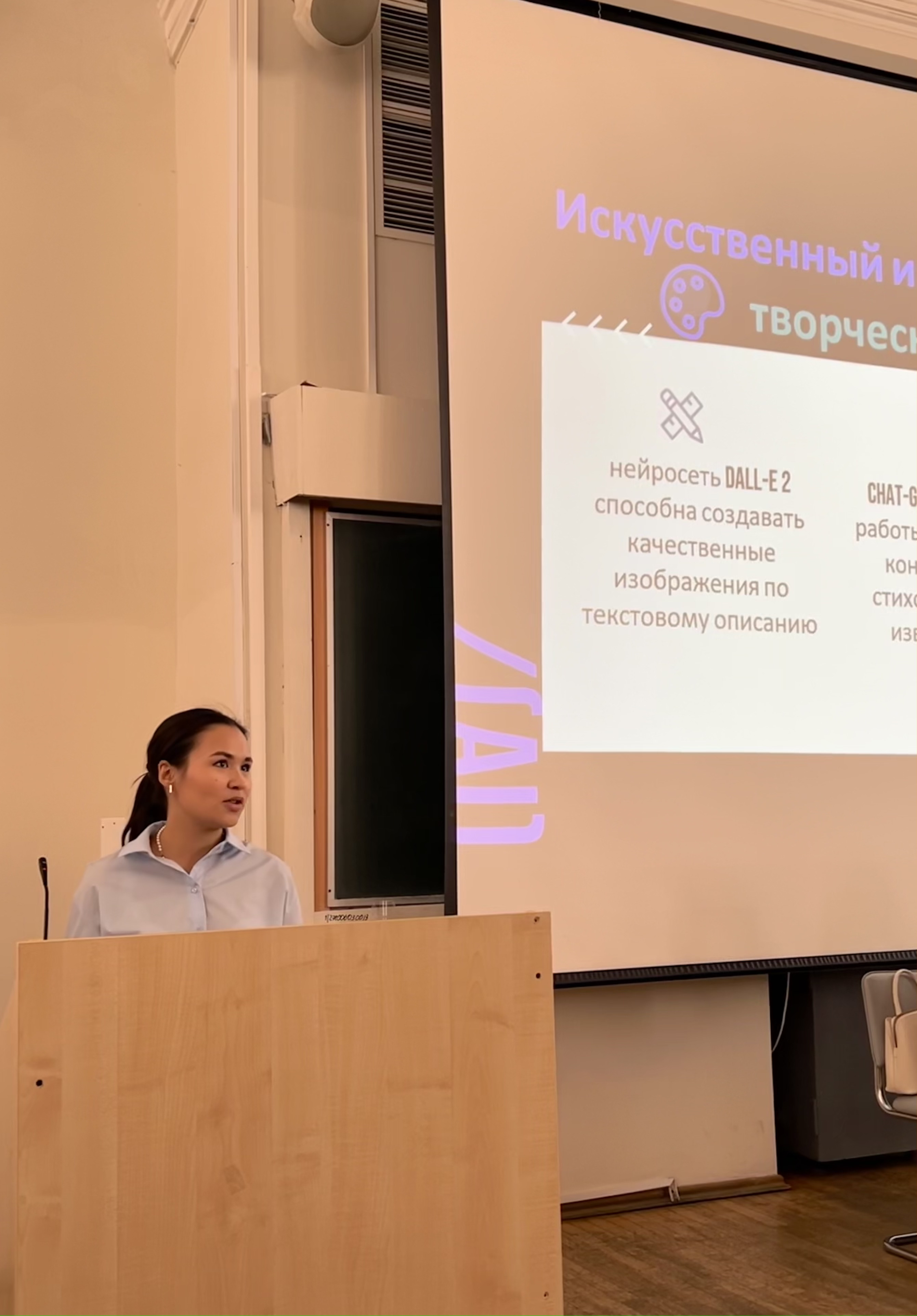С вступительным и заключительным словами выступила Ситдикова Роза Иосифовна и обозначила важную проблему - чат GPT. Так, мероприятие было завершено стихотворением, написанным искусственным интеллектом: