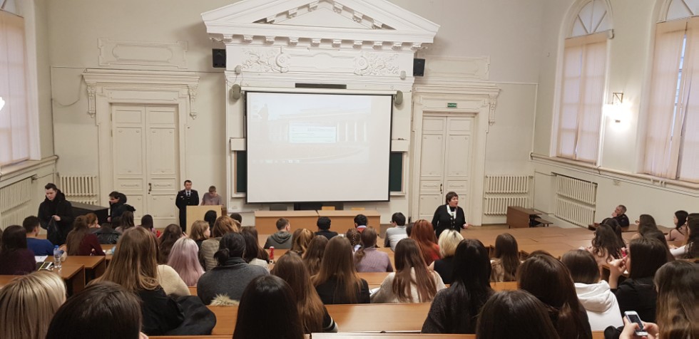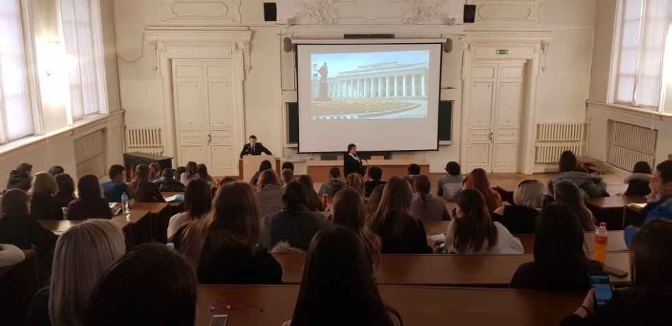 Павлов Дмитрий Евгеньевич, лейтенант отдела по контролю за оборотом наркотиков провел беседу о профилактике употребления и распространения наркотических средств и психотропных веществ. Начальник отдела по работе с личным составом Федотов Александр Алексеевич провёл профориентационную работу среди студентов и рассказал о требованиях, предъявляемых к работнику службы Министерства внутренних дел.
