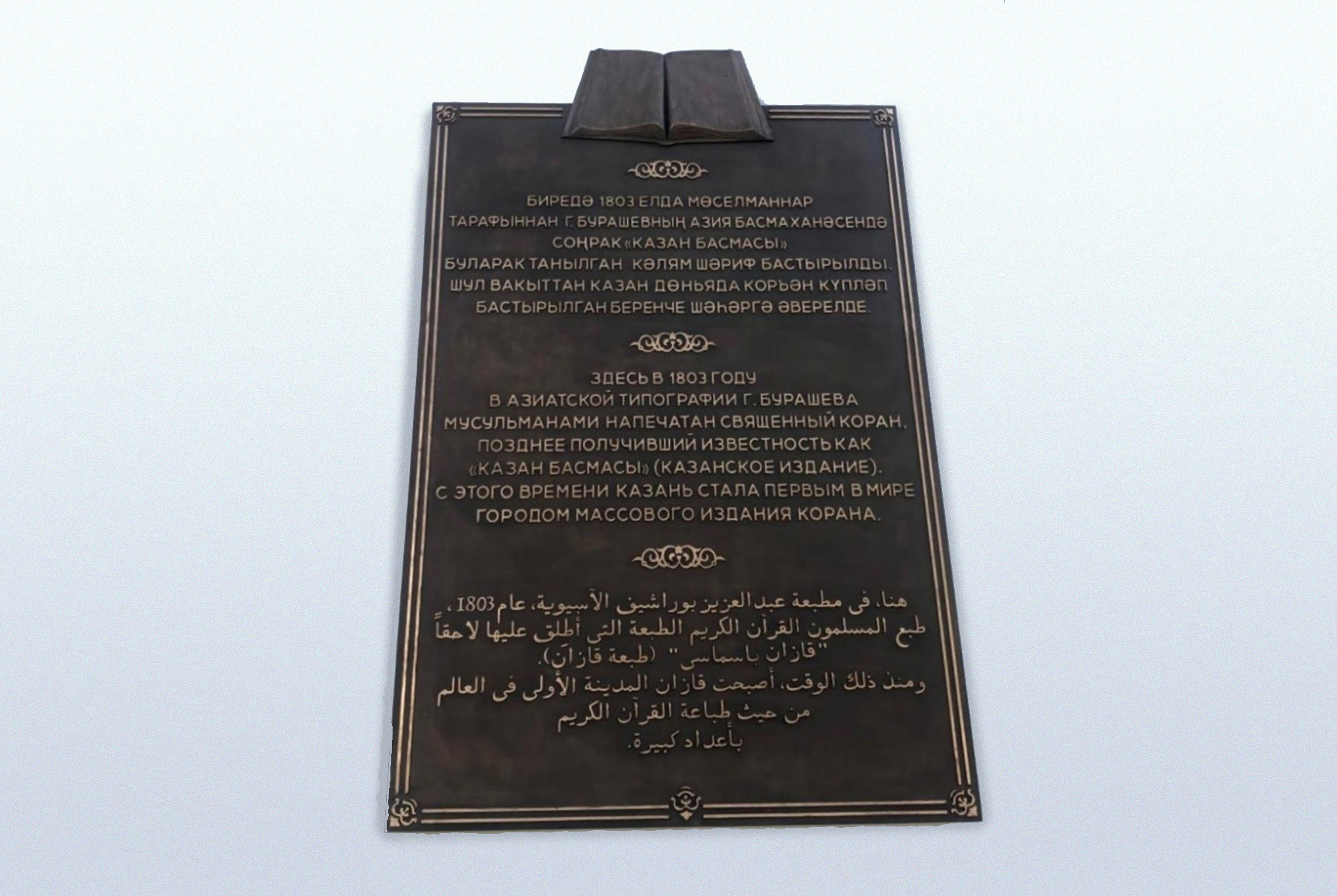 В Казанском федеральном университете состоялась торжественная церемония открытия мемориальной доски в честь появления в Казани первой в мире татарской типографии и издания в ней татарскими печатниками во главе с Габдельгазизом Бурашевым Священного Корана в 1803 году.