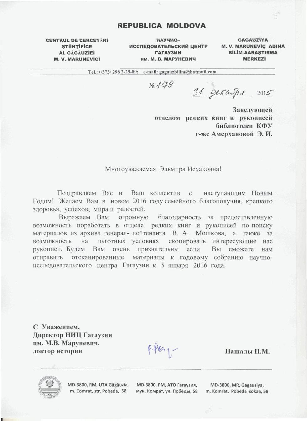 ![]() | Благодарность заведующей отделом рукописей и редких книг Амерхановой Э.И. от Научно-исследовательского центра Гагаузии им. М. В. Маруневич Республика Молдова за предоставленную возможность поиска материалов из архива генерал-лейтенанта В. А. Мошкова в фондах Научной библиотеки им. Н. И. Лобачевского |