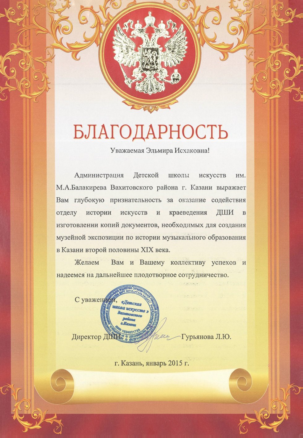 | Благодарность заведующей отделом рукописей и редких книг Научной библиотеки им Н. И. Лобачевского Амерхановой Э. И. от Администрации Детской школы искусств им. М. А. Балакирева Вахитовского района г. Казани за оказание содействия отделу истории искусств и краеведения школы |