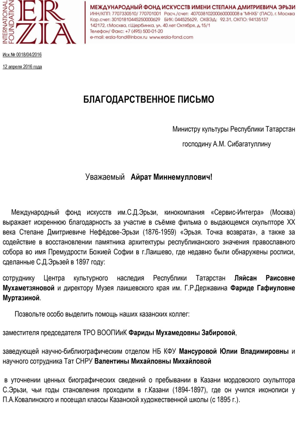 | Благодарственное письмо заведующей научно-библиографическим отделом Научной библиотеки им. Н. И. Лобачевского Мансуровой Ю.В. от Международного фонда искусств им. С.Д. Эрьзи и кинокомпании «Сервис-Интегра» за оказанное содействие в уточнении ценных биографических сведений о пребывании в Казани мордовского скульптора С. Эрьзи. |