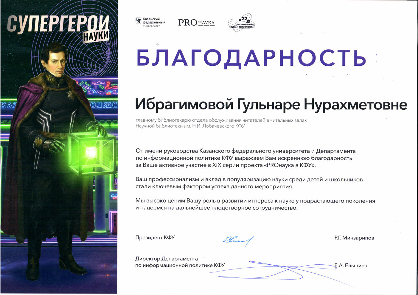 | Благодарность директору Е.Н. Струкову и коллективу отдела рукописей и редких книг Научной библиотеки им. Н.И. Лобачевского под руководством заведующего Э.И. Амерхановой от Секретаря Государственного Совета РТ за содействие в получении копий номеров газеты «Знамя Труда» за 1920 год и проявленный профессионализм. |