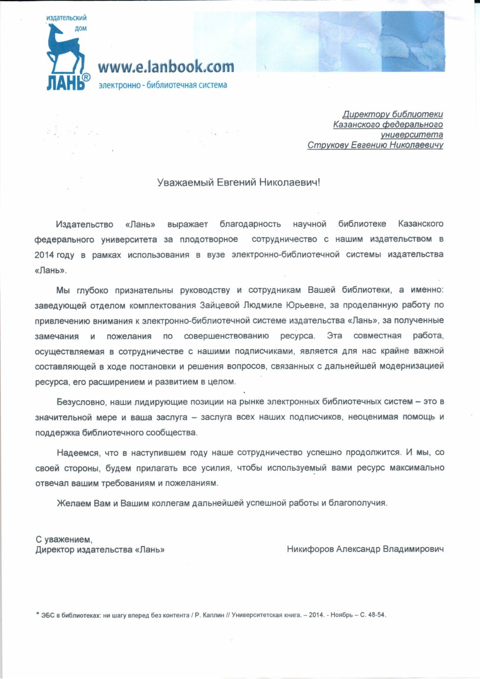 ![]() | Благодарность директору Е.Н.Струкову и библиотеке вуза от ООО «ЭБС Лань» за использование ЭБС в учебном процессе и продвижение ресурса. |