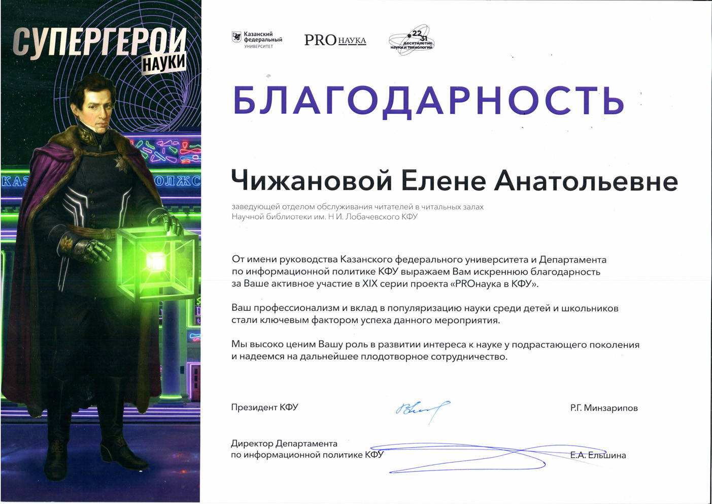 | Благодарности сотрудникам отдела обслуживания читателей в читальных залах - Чижановой Елене Анатольевне, Ахмеджановой Алсу Гараевне, Ибрагимовой Гульнаре Нурахметовне, Мамаковой Татьяне Васильевне от имени руководства Казанского федерального университета и Департамента по информационной политике КФУ за активное участие в XIX серии проекта "PROнаука в КФУ", профессионализм и вклад в популяризацию науки среди детей и школьников. |