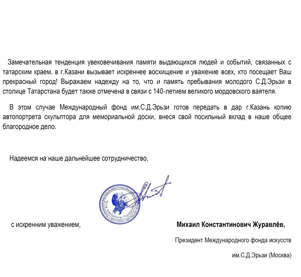 | Благодарственное письмо заведующей научно-библиографическим отделом Научной библиотеки им. Н. И. Лобачевского Мансуровой Ю.В. от Международного фонда искусств им. С.Д. Эрьзи и кинокомпании «Сервис-Интегра» за оказанное содействие в уточнении ценных биографических сведений о пребывании в Казани мордовского скульптора С. Эрьзи. |