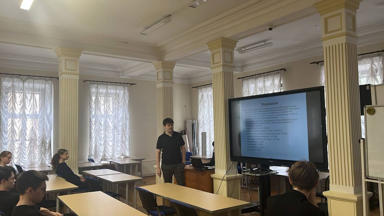 Перед учениками 10Е и 11Е классов выступил врач-оториноларинголог Максим Золотенин с темой «Грипп и острые респираторные инфекции верхних дыхательных путей». Ученики узнали о мировой статистике распространения вируса гриппа. При вирусе гриппа есть характерные симптомы, связанные со слизистыми верхних дыхательных путей. Повышение температуры тела незначительное, держится 2-3 дня. Максим Константинович также рассказал о лечении. Необходимо ограничить доступ к больному, использовать респираторы, проветривать комнаты. Необходимо придерживаться лечебного питания (диеты), насыщенного витаминами С, D, группы В. Симптоматическая терапия рекомендуется лишь при температуре выше 38,5. Вакцинация против гриппа рекомендована лицам, находящимся в группе риска (пожилые, дети, люди с неустойчивым иммунитетом). Но самая лучшая мера профилактики — промывание носа водой раз в день.