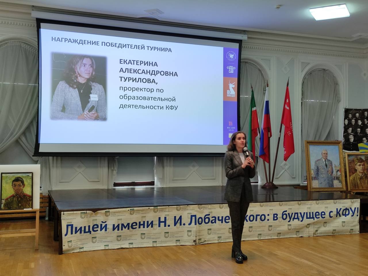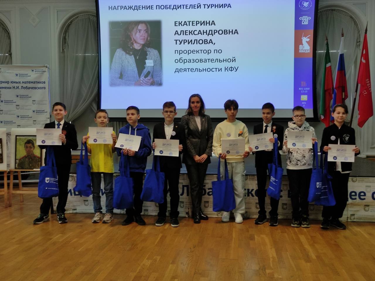 Открыла церемонию награждения проректор по образовательной деятельности КФУ Екатерина Турилова, поблагодарив всех гостей за большой интерес к Турниру юных математиков имени Н.И. Лобачевского, а также активное участие в мероприятиях, проводимых Казанским федеральным университетом.