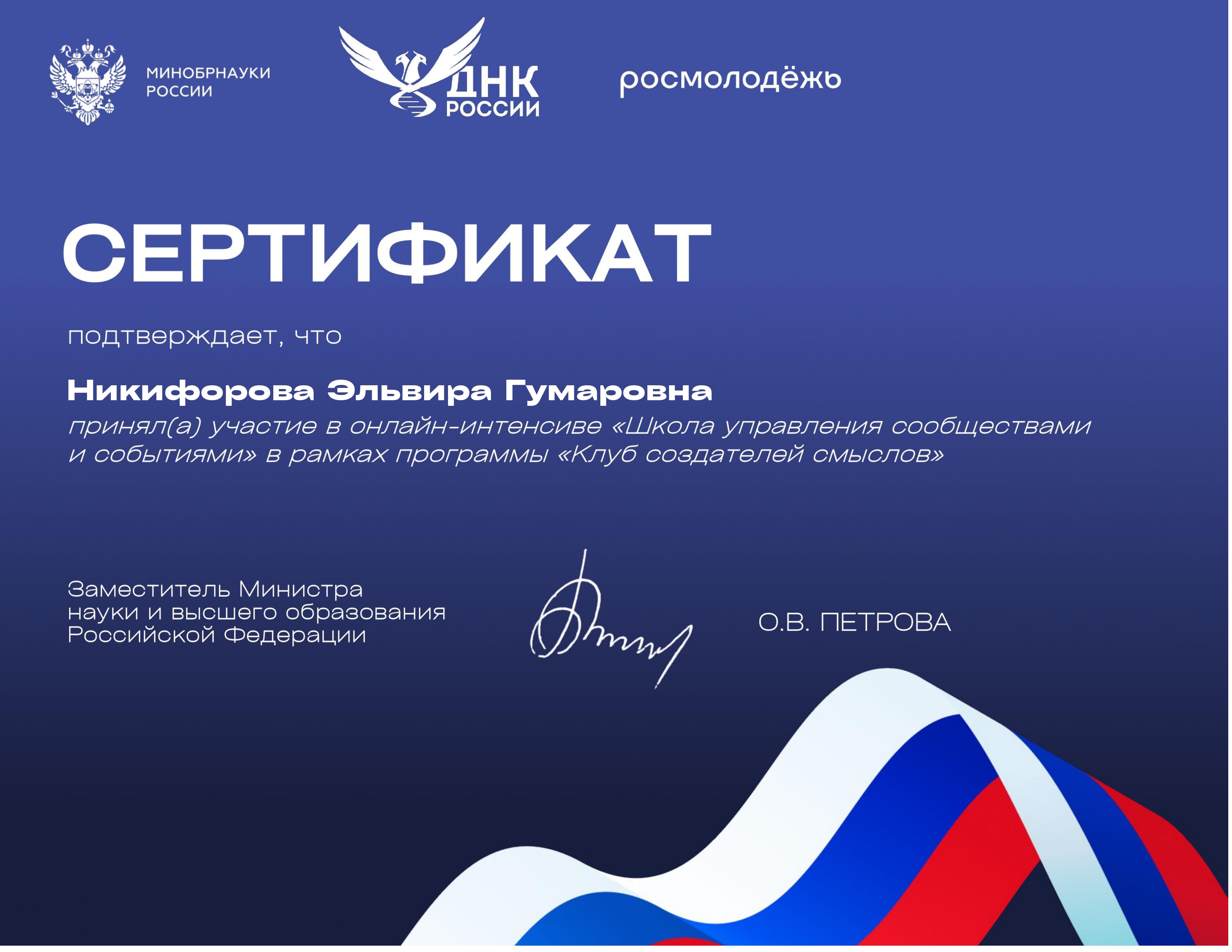 Преподаватель кафедры Общего менеджмента Э.Г. Никифорова приняла участие в онлайн-интенсиве "Школа управления сообществами и событиями" в рамках программы "Клубы создателей смыслов" от Министерства науки и высшего образования России, Росмолодежи и проекта 'ДНК России'