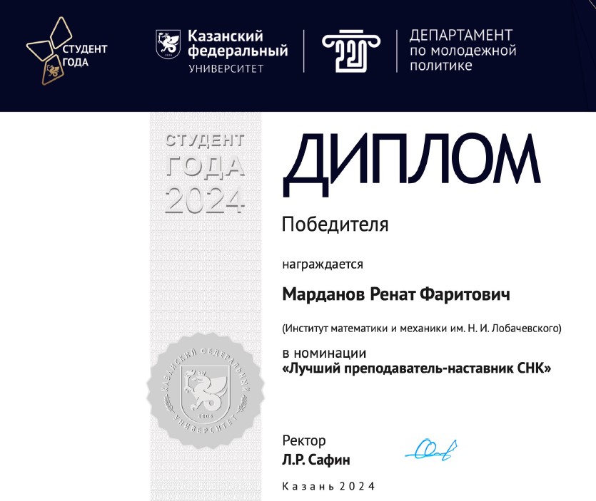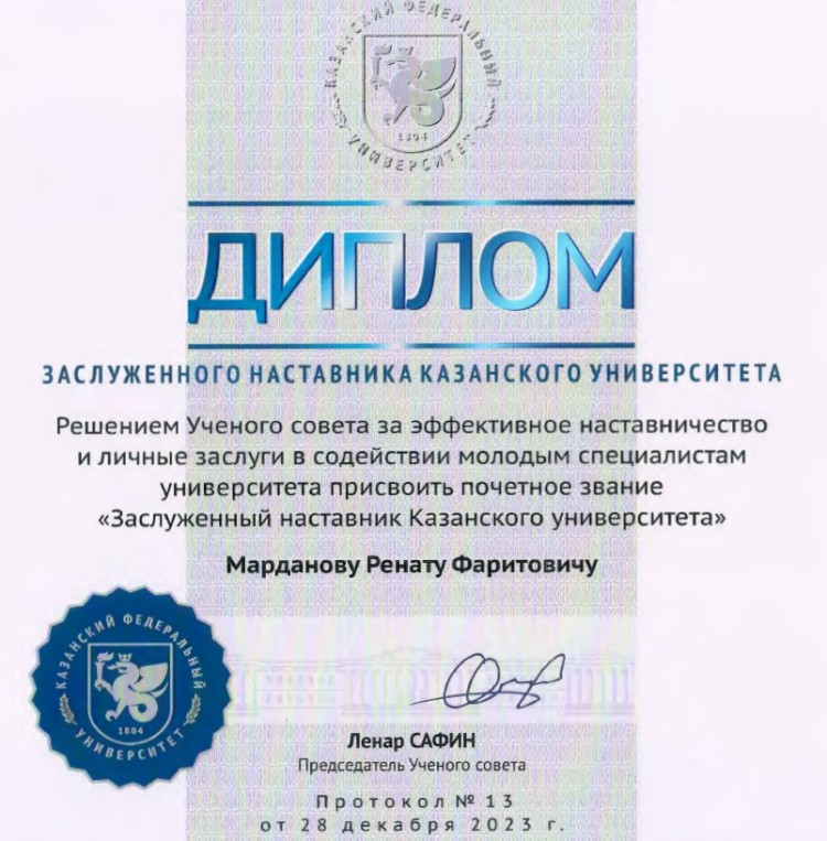За прошедший 2024 год наставническая деятельность Р.Ф. Марданова была трижды отмечена на университетском и республиканском уровне. Решением Ученого совета КФУ ему присвоено почетное звание «Заслуженного наставника Казанского университета». Министерством образования и науки Республики Татарстан он был награжден знаком отличия «Почетный наставник». На церемонии «Студент года – 2024» Р.Ф. Марданов был отмечен дипломом победителя в номинации «Лучший преподаватель-наставник СНК».