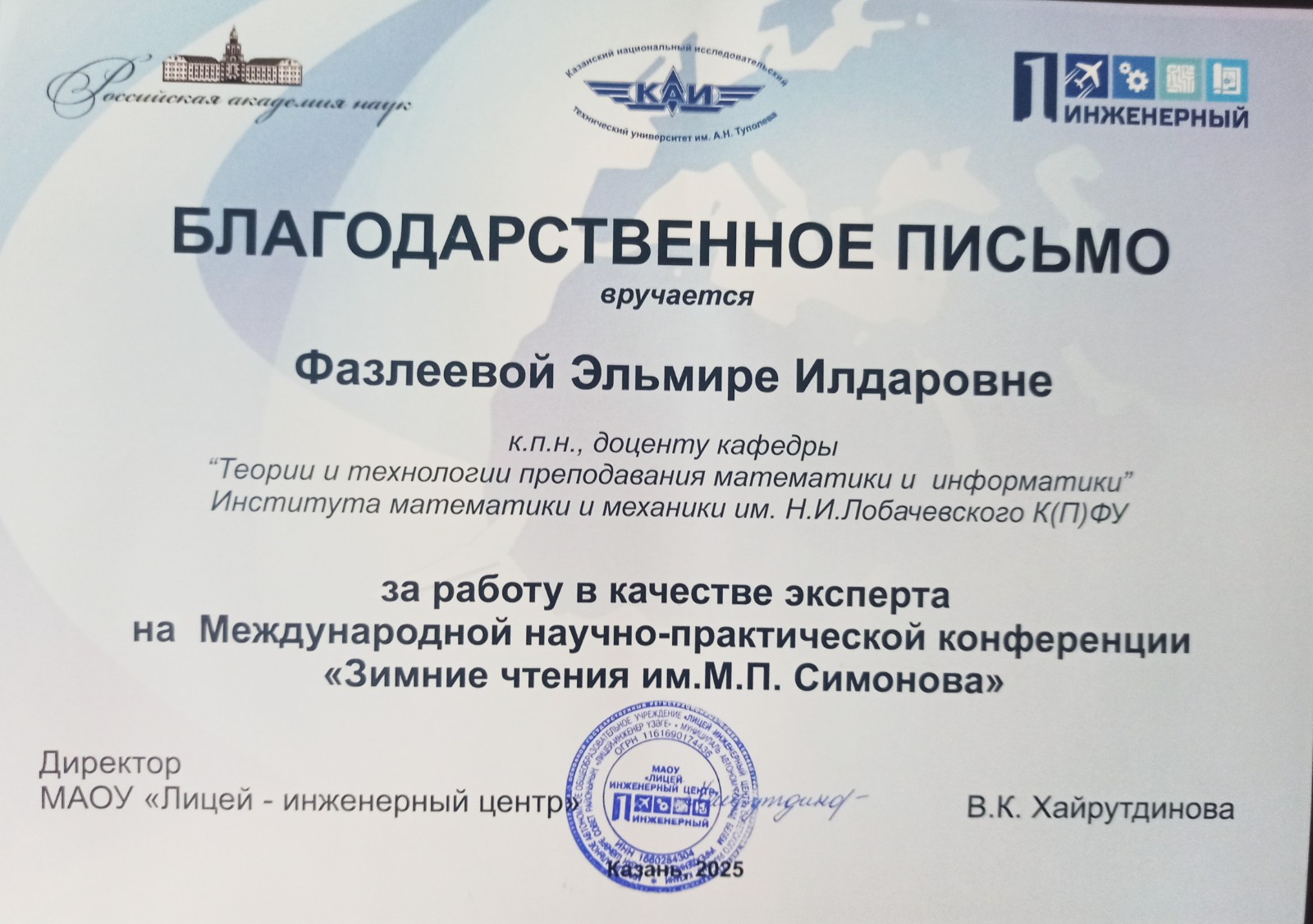 13 марта 2025 года в МАОУ «Лицей-инженерный центр» г. Казани состоялась Международная научно-практическая конференция школьников «Зимние чтения имени М.П. Симонова».