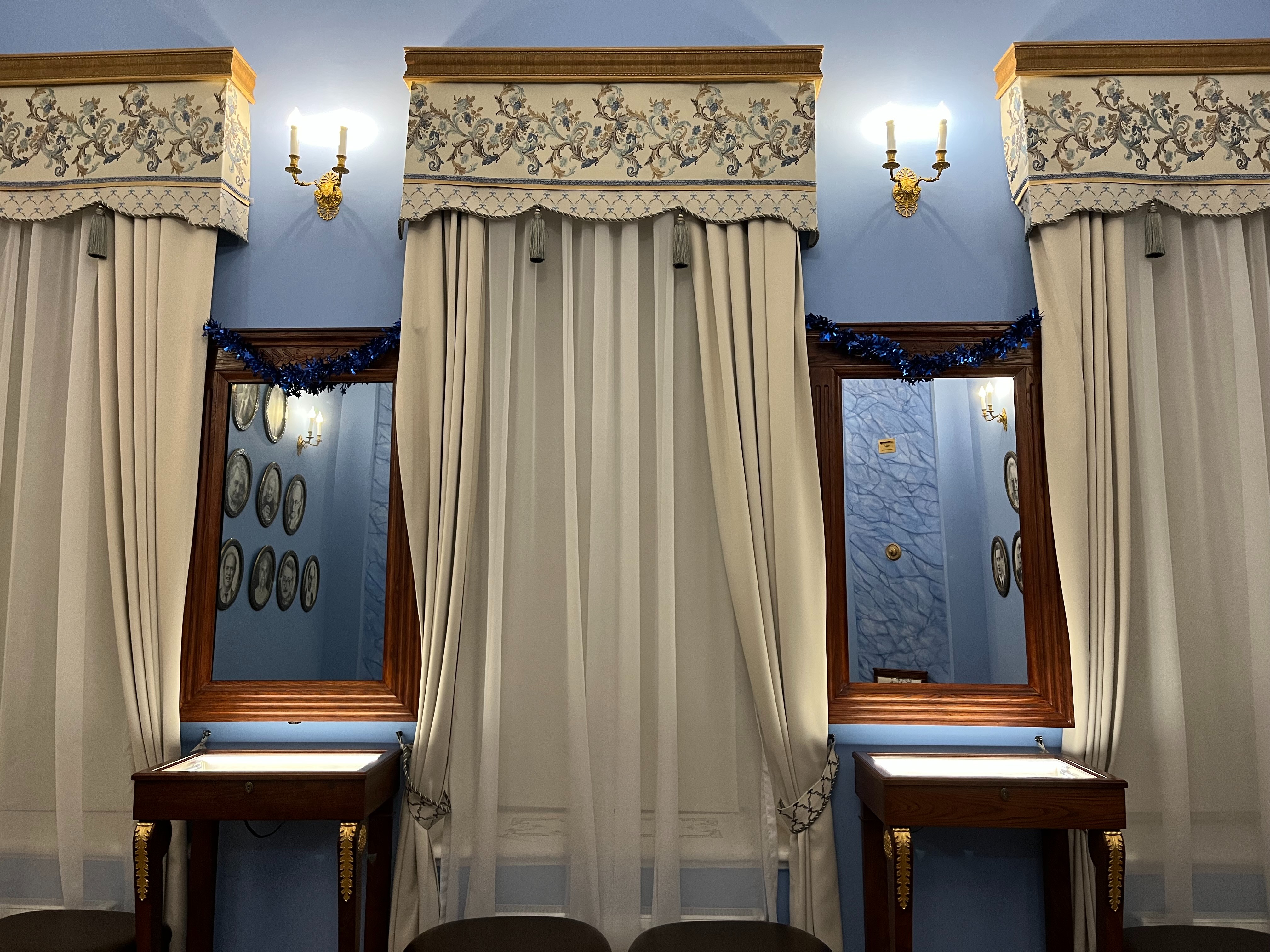 Побывали мы и в «Голубой гостиной», которая воссоздает облик дворянского дома XIX века, где стоят шкафы-витрины с посудой, диван, кресла, зеркала (одно из которых превращается в экран, где можно посмотреть соответствующую видеотеку), а вместо семейных висят портреты лауреатов премии Лобачевского.