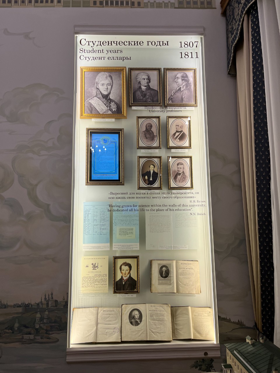 Благодаря экскурсоводу, Андрею Афанасьеву, узнали много интересного о жизни и научном пути нашего земляка. В зале, посвященном становлению Лобачевского, хранится копия письма его матери, Прасковьи Александровны Лобачевской, о просьбе зачислить Николая в Казанский университет. Мы с интересом его прочитали. Первое упоминание о Николае Лобачевском в газете «Казанские известия» датировано концом 1811 года. Тогда в издании было опубликовано сообщение о наблюдениях кометы, которые провёл Лобачевский вместе с другом, однокашником, И. М. Симоновым. Этот эпизод упомянут и в романе Л. Толстого «Война и мир».