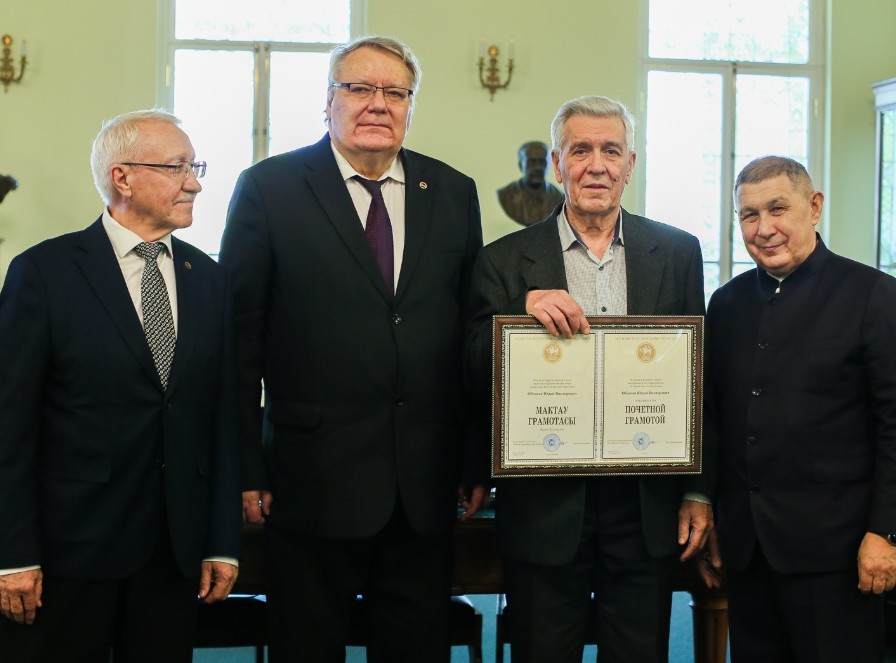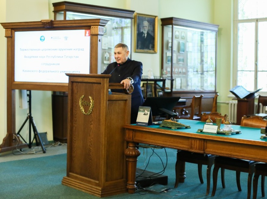 В Музее истории Казанского университета президент Академии наук Республики Татарстан Рифкат Минниханов вручил ученым КФУ почетные грамоты АН РТ. Отмечен их вклад в развитие науки, выдающиеся научные работы, открытия и изобретения.