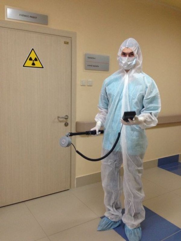Хотите, чтобы описал свой кабинет? 10 квадратных метров, стул, стол с компьютером и телефоном, кушетка, свинцовое мусорное ведро с крышкой. Позвонил медсестре, попросил приводить на замер. По правилам, пациенты приходят ко мне, обязательно приняв душ и в однодневной одежде, чтобы уменьшить фон излучения.