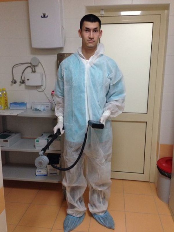 С утра, как и положено, решил проверить вакуумные системы, которые находятся в подвале в активной зоне. Не скажу, что мой путь вниз доставил мне удовольствие: тащить на себе 18 килограмм защитного халата и около килограмма шапочки не покажется легким даже сумоисту. Но защита превыше всего! По технике безопасности обычно я хожу на работе в маске. Но если мне понадобится зайти в коридор для пациентов либо в КОБРО - в активную зону - тогда только в защитной одежде.