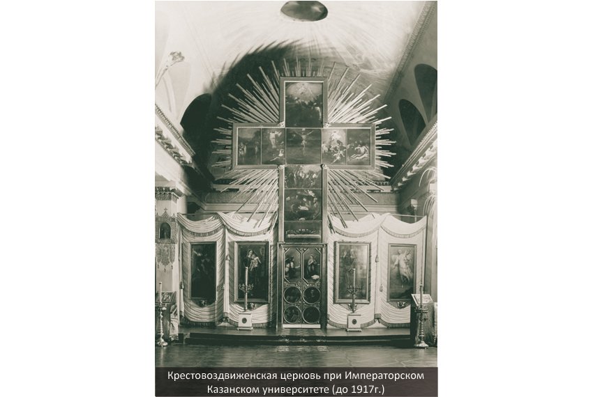 Музею было выделено одно из самых примечательных помещений главного корпуса университета, которое имеет интересную историю. В конце XVIII века на окраине Воскресенской улицы (ныне улица Кремлевская) был выстроен двухэтажный дом для губернатора. В 1798 году этот дом передали Первой Императорской Казанской гимназии; в его западной части разместились классные комнаты и физический кабинет. В 1825 году после завершения строительства по проекту архитектора П.Г.Пятницкого университетского корпуса, соединившего здание гимназии с «тенишевским» домом (так он назывался по имени прежнего владельца), это помещение было перестроено в церковь. После 1917 года она использовалась как физкультурный зал, в 1941-1943 годах в ней оборудовали общежитие для эвакуированных сотрудников Академии Наук СССР из Москвы и Ленинграда; позднее в течение двух десятилетий здесь работал один из читальных залов Научной библиотеки имени Н.И.Лобачевского.