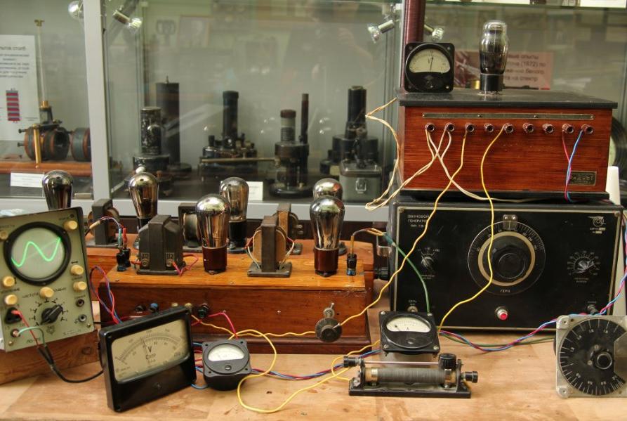 1. генератора Генератор собран по схеме электронной связи на лампе СО-182 (лампа Варемю). Генератор с электронной связью представляет собой двухкаскадный генератор, собранной на одной многоэлектродной лампе (тетрод или пентод). Такой генератор представляет сочетание генератора с самовозбуждением и усилителя колебаний на одной лампе. Данная схема генератора называется схемой с электронной связью, потому, что связь между генератором с самовозбуждением и усилителем осуществляется через электронный поток лампы. Выбор схемы на пентоде определился возможностью плавного подхода к генерации при помощи регулировки напряжения экранной сетки. «Колебательный контур состоит из конденсатора с переменной емкости от 15 до 100 см.(пФ), катушки L из 15 витков, диаметром от 18 м. до 200ми фидера Ф длиной 40 см, позволяющего вывести катушку L из экрана генератора в межполюсное пространство электромагнита.» 2. триодного резисторного усилителя низкой частоты Это усилитель американской фирмы PhysicistsResearchCo на триодных лампах (четыре первых лампы 7С6, выходная лампа 6L5G). Выход усилителя - трансформаторный, к которому подключается термогальванометр или осциллограф. 3. Пентодного резонансного трансформаторного усилителя низкой частоты на 50 Гц. При внимательном рассмотрении и изучении этой схемы выясняется, что он состоял из двух усилителей низкой частоты. а) двухлампового трансформаторного усилителя на лампах СО-187 б) четырехлампового трансформаторного усилителя на лампах СБ-155 4. Зеркального гальванометра Зеркальный гальванометр Hartmann&BraunA.G. №224655, чувствительностью 10-9 А. Он использовался, когда работал только генератор высокой частоты. Гальванометр подключался к сетке лампы генератора. К выходу резонансного усилителя 50 Гц подключался короткопериодичный гальванометр (собственный период 137 Герц и внутреннее сопротивление 10 Ом). Гальванометр обладал чувствительностью 10-5 ампера на миллиметр при одном метре расстояния от зеркала гальванометра до шкалы и скомпенсирован батареей 6 Вольт через сопротивление порядка 2000Ом 5. Осциллографа Катодный осциллограф тип-51 состоял из электронно-лучевой трубки, а развертка осциллографа осуществлялась генератором развертки на тиратроне ТГ-212. Исследуемый сигнал подавался непосредственно на вертикальные пластины электронно-лучевой трубки. 6. Электромагнит «Дю-Буа» Использовался для создания регулируемого постоянного магнитного поля. Величина магнитного поля достигала до 5000 Э. «Для модуляции между полюсами электромагнитна помещались два витка из толстой прямоугольного сечения шины из электролитической меди. Витки соединялись параллельно и для большей жесткости были скреплены в эквипотенциальных точках тремя перемычками из той же чистой меди. Концы катушки подключались через амперметр на 300 А в трансформатор на 2 вольта и 300 ампер. Первичная обмотка питалась от городской сети переменного тока частоты 50 Гц через реостат.» Для измерения в низких полях магнит «Дю-Буа» не использовался, а электромагнитное поле создавалось соленоидом, состоящим из 6 витков, диаметром 12 см., который питался от сварочного трансформатора. Для реставрации измерительной установки, описанной в докторской диссертации, мы использовали схемы и рисунки из диссертации и научных дневников Е.К. Завойского. Также использовалась литература 20-30-40-
