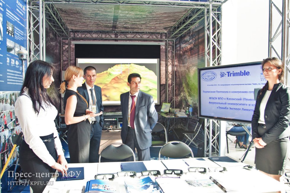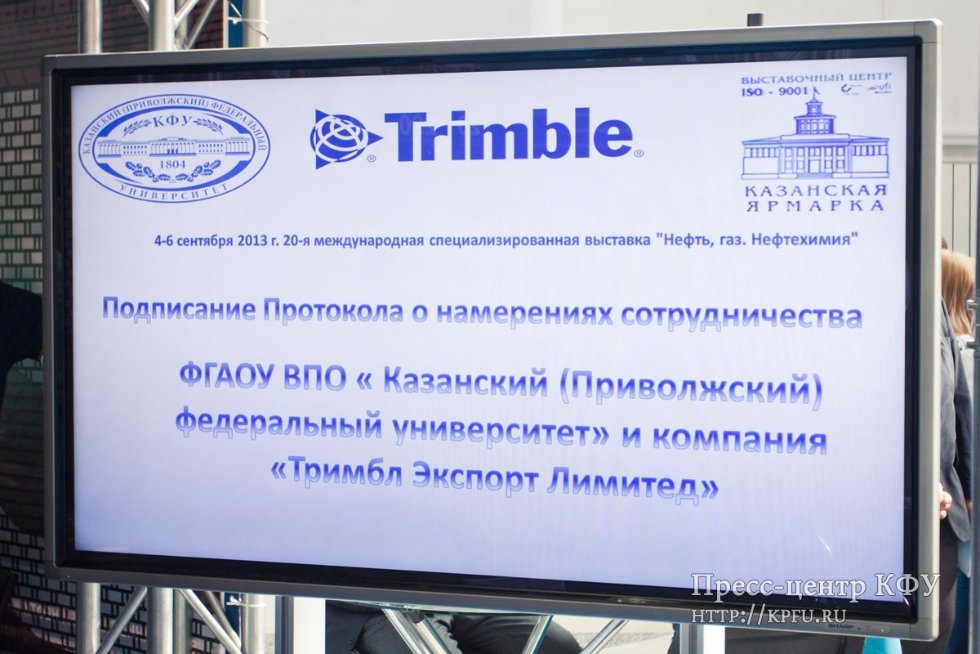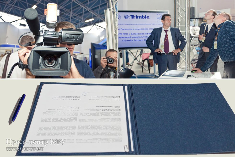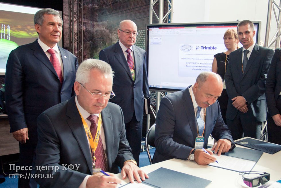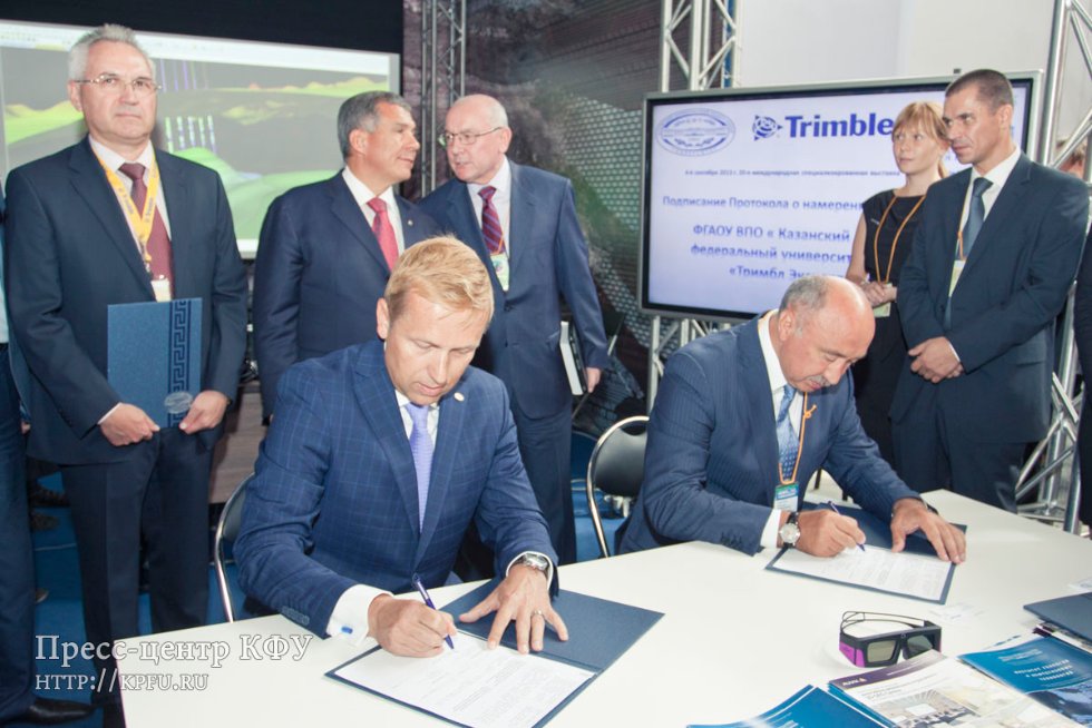 К посещению экспозиции Президентом РТ было приурочено подписание протоколов о намерениях сотрудничества. Казанский федеральный университет в лице ректора Ильшата Гафурова подписал два документа: первый - с главой московского представительства компании TRIMBLE Георгием Мосоловым, второй – с генеральным директором ЗАО «Эколаб» Вацлавом Харантем. КФУ с данными предприятиями связывают давние партнерские связи. Подписанные сегодня протоколы – очередной шаг в развитии сотрудничества.