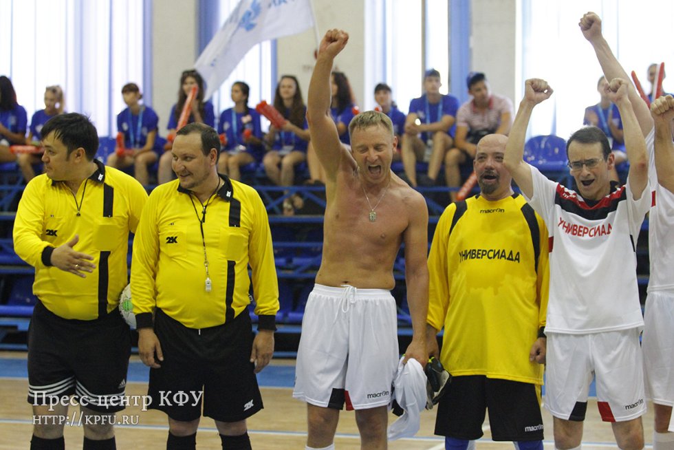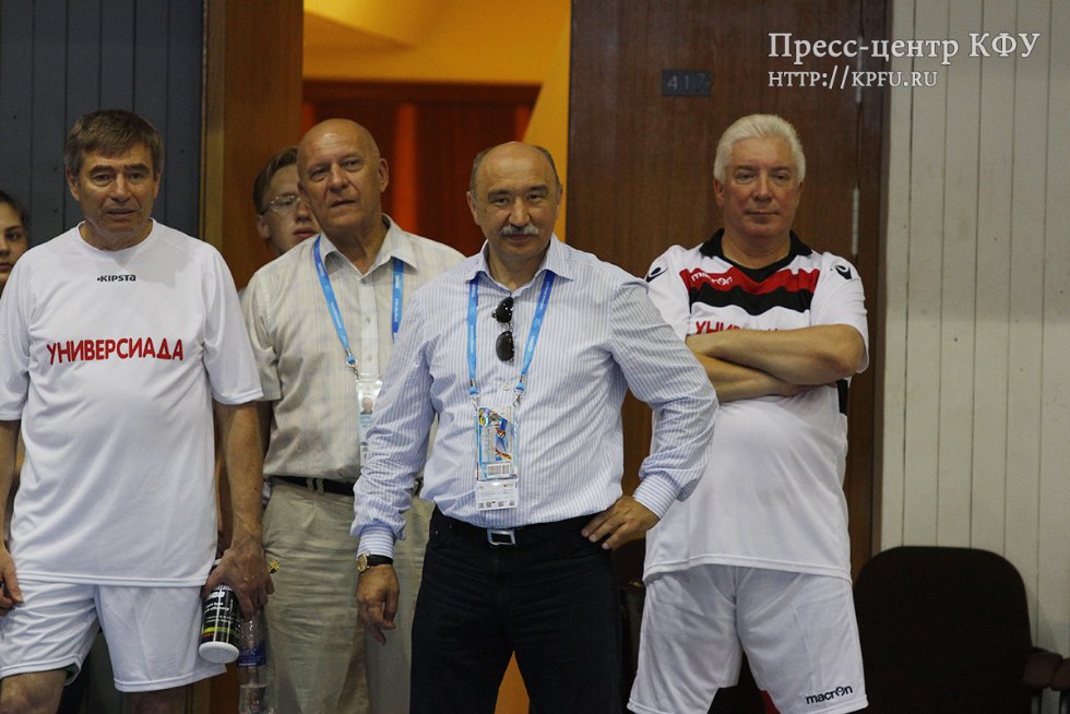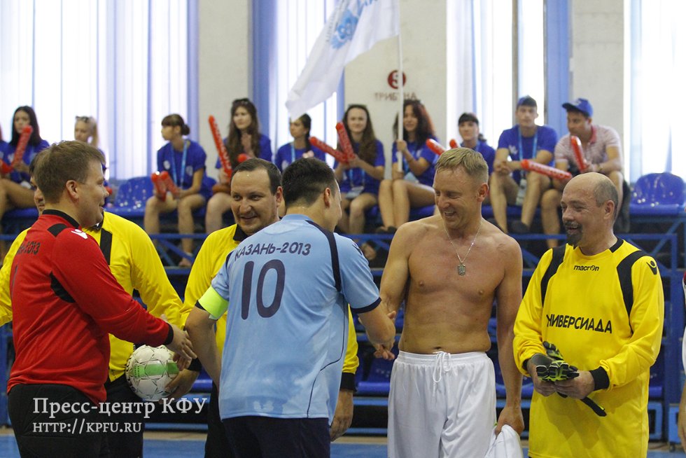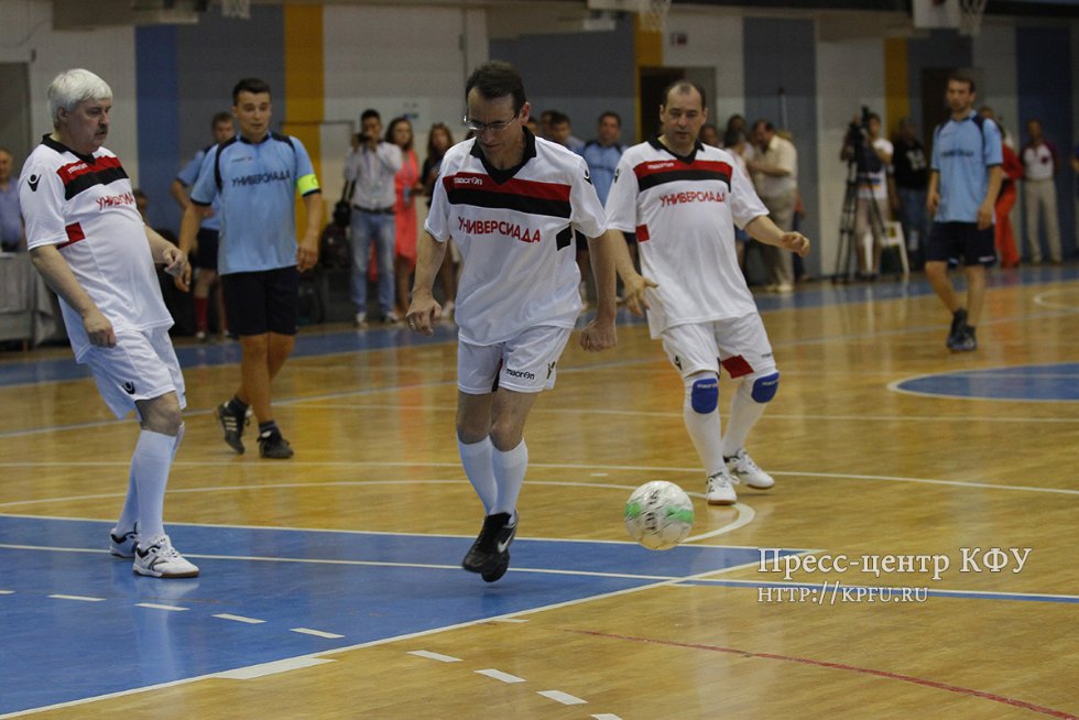 Матч был очень эмоциональным, и та, и другая стороны были настроены только на победу! После окончания первого тайма команда «Казань-2013» вела со счетом 2:1. «Очень важно показать, что мы тоже в отличной форме и можем дать бой молодым, ‑ оптимистично заявил в перерыве Дмитрий Ливанов. ‑ Мне кажется, что все очень довольны, в Казани ощущается великолепная дружелюбная обстановка. Сегодня в команде наших соперников есть даже легионеры, поэтому у нас такое форменное интернациональное международное спортивное состязание. Особенность казанских студентов мы еще увидим, пока они показывают спортивный характер. Они нас жалеют, но, на самом деле, мы вполне равны по силам, во втором тайме, думаю, отыграемся».