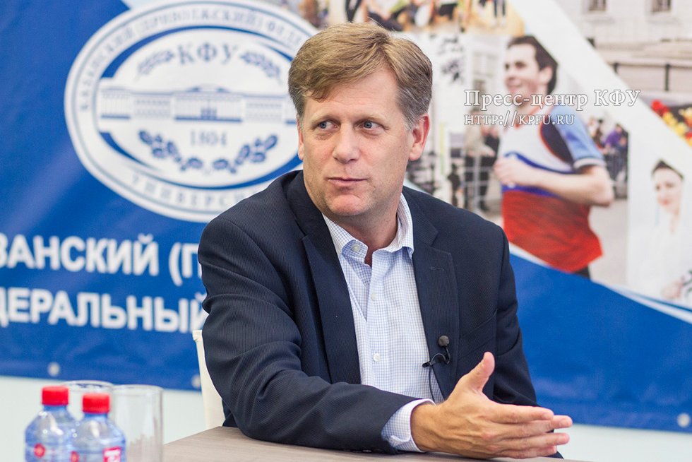 Встрече предшествовала небольшая пресс-конференция для ряда татарстанских СМИ, в ходе которой господин Посол сообщил, что прибыл в столицу Татарстана на открытие Всемирной Универсиады вместе с супругой и сыновьями и не мог упустить возможности пообщаться с теми, кто в то или иное время получил дополнительное образование в США, и с представителями соотечественников. Майкл Макфол выразил признательность КФУ за организацию такой встречи.